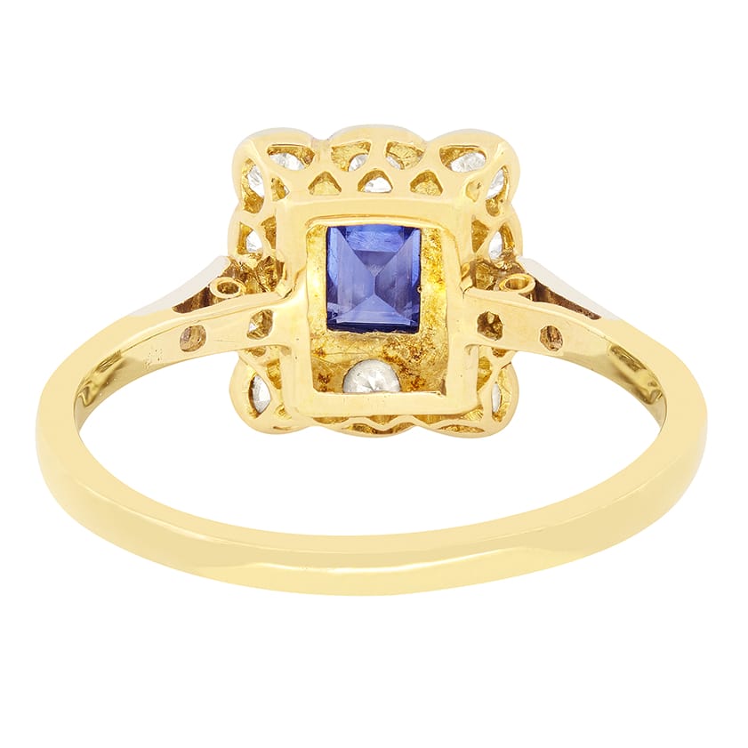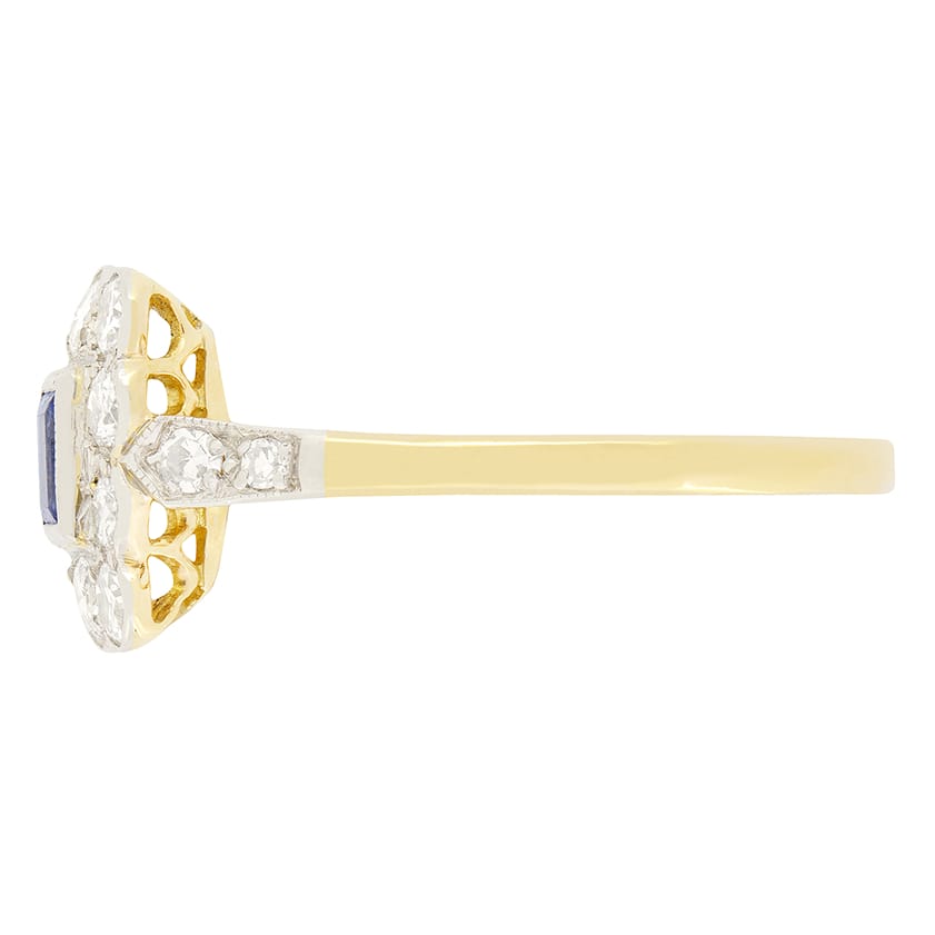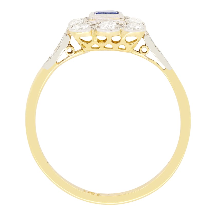 This delightful Edwardian cluster ring centres around a 0.25 carat sapphire, surrounded by sparkling old cut diamonds. The blue sapphire is an emerald cut stone, rub over set into a platinum head. The surrounding old cut diamonds both encircle the sapphire and flow down each shoulder. Totalling 0.56 carat, the diamonds match in quality at G in colour and VS in clarity, offering a brilliant contrast to the vibrant blue sapphire. The platinum head and shoulders, sit upon a basket and band hand crafted in 18 carat yellow gold, a metal combination classic of the 1910s.