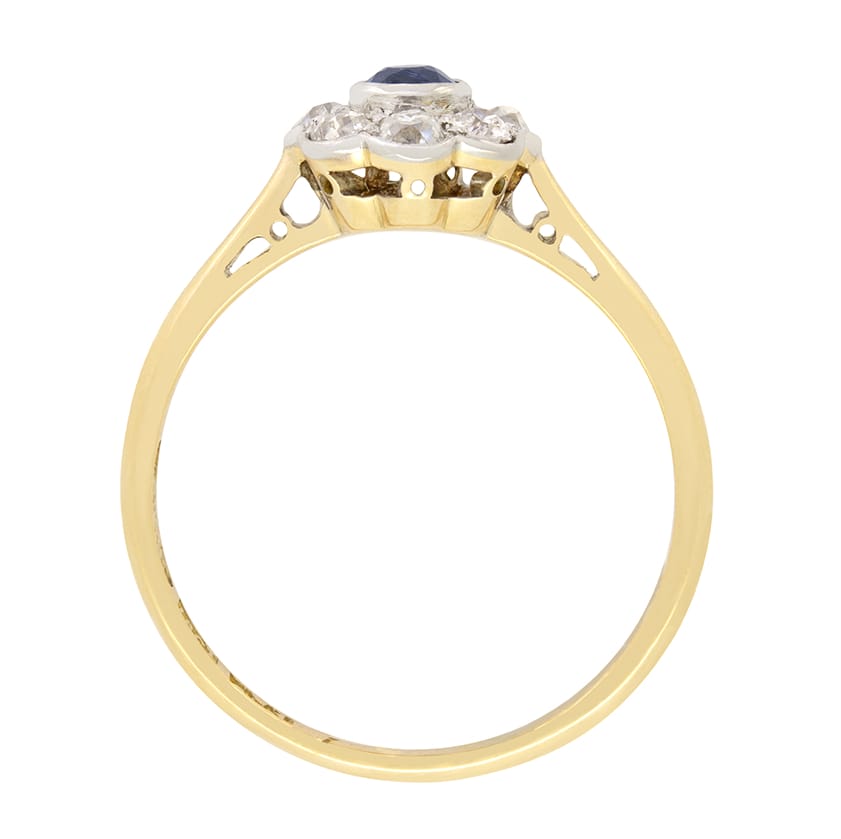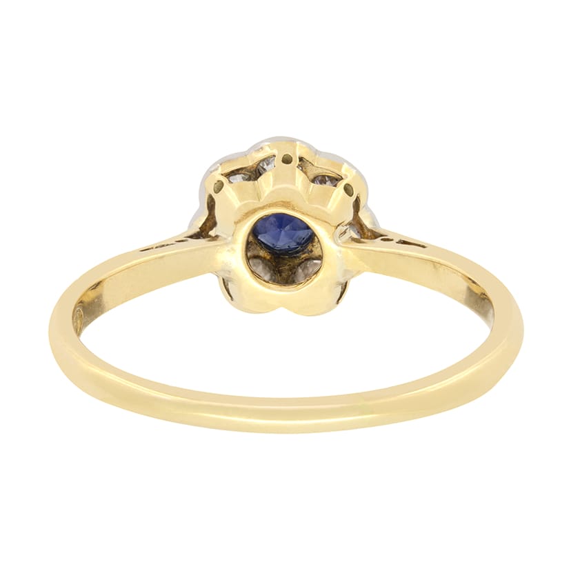 This charming cluster ring dates back to the Edwardian period. At its centre lies a deep blue, old cut sapphire. The sapphire weighs 0.25 carat and has been rub over set into platinum. Surrounding the sapphire are seven old cut diamonds, each weighing 0.10 carat, forming a beautiful daisy like cluster. They each match in quality with H in colour and VS in clarity. The stones are meticulously set into platinum, with a contrasting 18 carat yellow gold basket and band. This elegant combination of platinum and yellow gold is typical of Edwardian design.