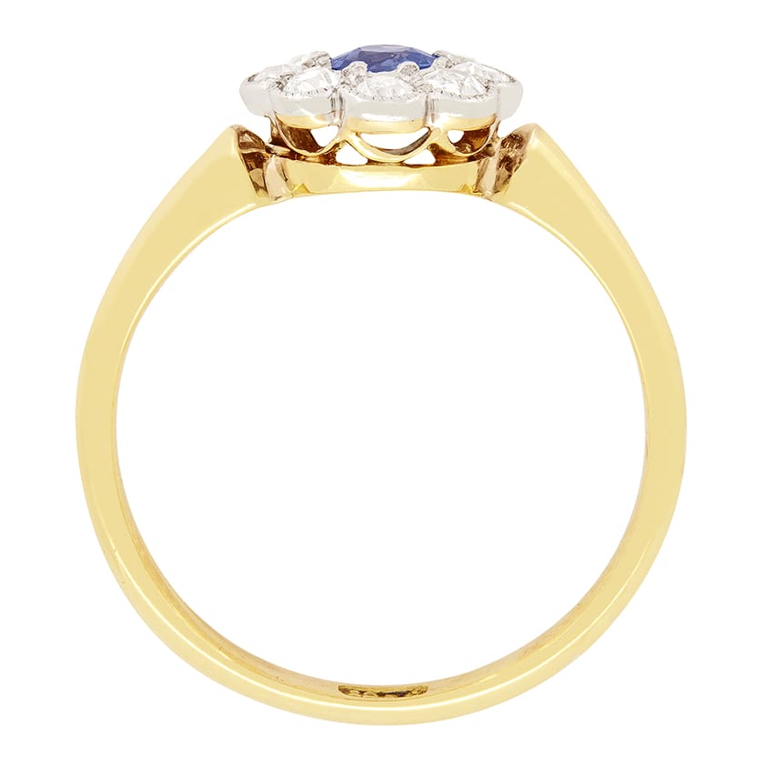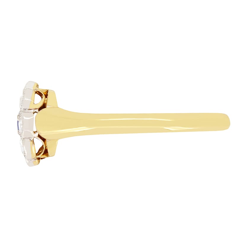 This lovely daisy cluster ring dates to the Edwardian period. A central blue sapphire is enveloped in old cut diamonds, creating the beautiful daisy shape. The old cut sapphire weighs 0.25 carat, whilst the diamonds total 0.40 carat. The diamonds have a colour of G and clarity of SI. All the stones had been claw set into the platinum head with Milgrain detailing tracing around the edge of the daisy design. The ring is finished with a tapered band of 18 carat yellow gold.