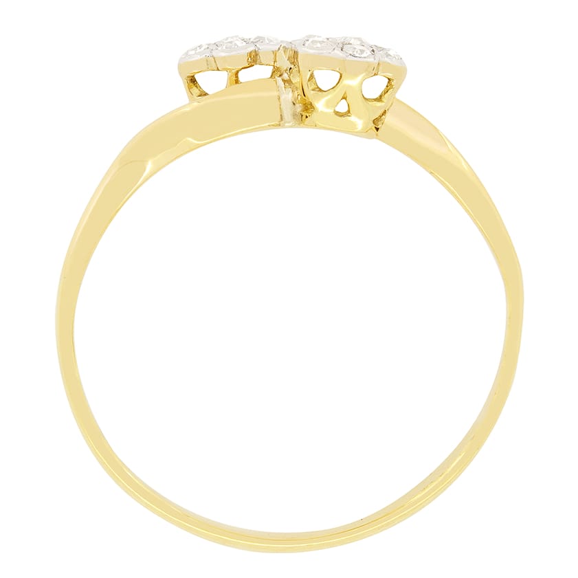 This Edwardian cluster ring features two charming daisy motifs set on a gracefully twisting band. Each daisy is adorned with old cut diamonds, with a total of 0.28 carats total across both clusters. The diamonds are H in colour and SI in clarity, grain set into a platinum head. The basket and band are crafted in 18 carat yellow gold contrasting the platinum head beautifully.