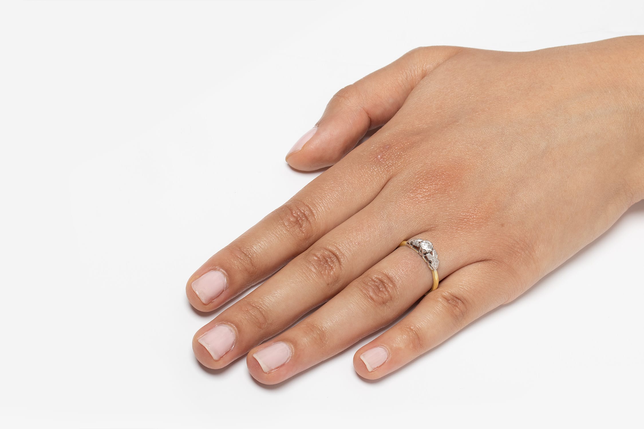 An elegant engagement ring dating back to 1910, the Edwardian era. It’s a wonderful little solitaire ring, with a single diamond weighing 0.30 carat. It is beautifully claw set within platinum, which would have been done by hand. The sleek collet is then perfectly attached to the 18 carat yellow gold band. The shoulders, which have been crafted into their unique design, are also made of platinum, and the small hoops in the gallery extend the level of stunning craftsmanship.