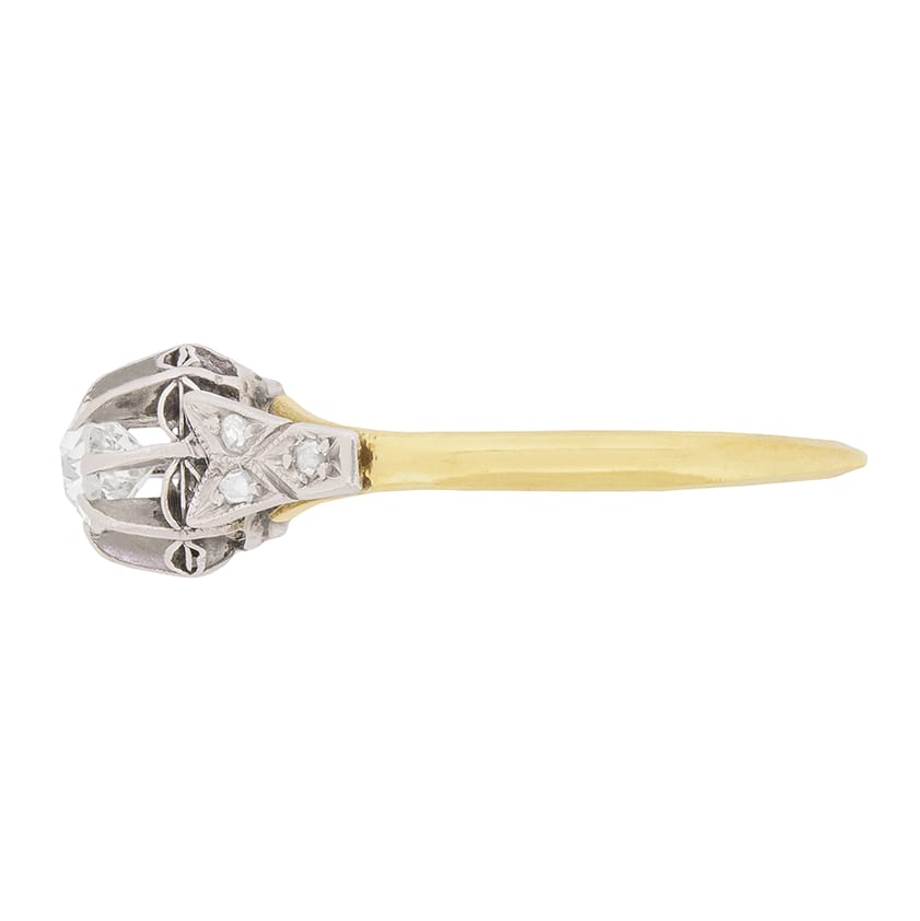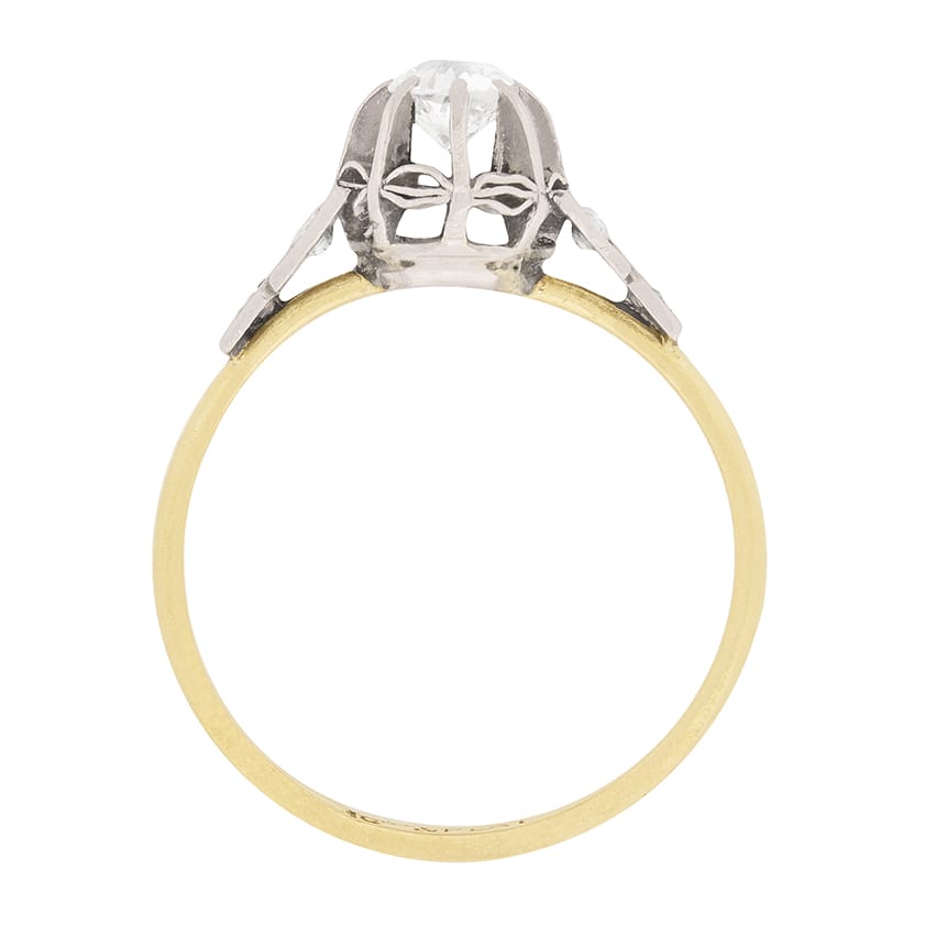 This classic solitaire features a 0.30 carat old cut diamond within a high claw setting. The diamond is estimated as G in colour and VS1 in clarity. The setting work, which has been made by hand, is all in platinum, as are the shoulders. The shoulders also have grain set rose cut diamonds with a combined weight of 0.06 carat. Typical of the Edwardian era, the shank is made in 18 carat yellow gold.