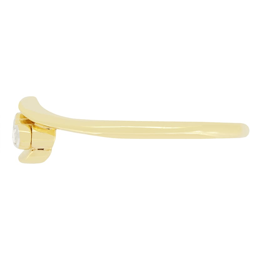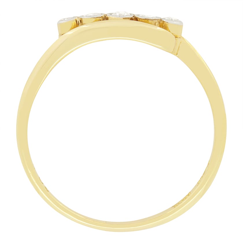 Crafted in the Edwardian period this charming twist ring features five glittering old cut diamonds. Totalling 0.30 carat the diamonds range in colour from G to H and match in clarity at VS. Each diamond has been expertly rub over set into platinum sitting at a slant across the finger. Enveloping the diamonds and wrapping elegantly around the finger a band of 18 carat yellow gold completes the look.