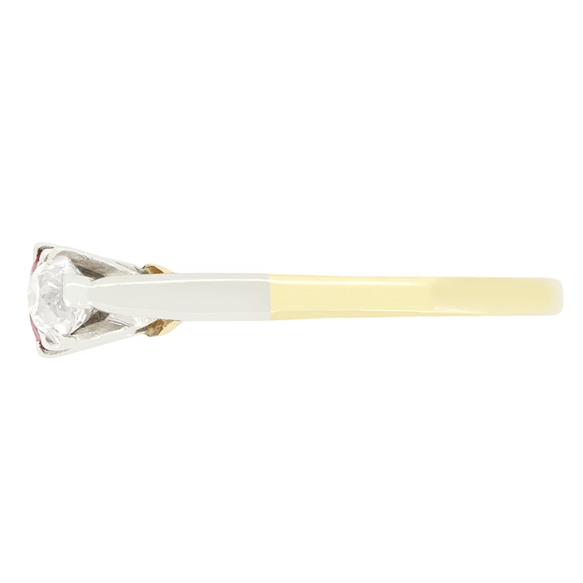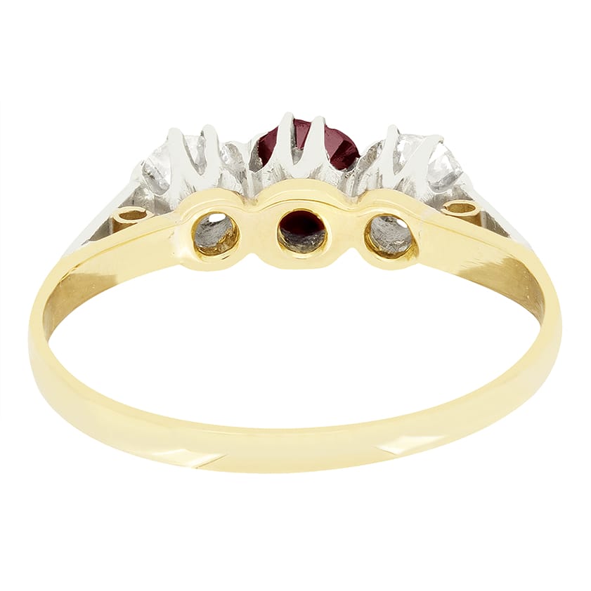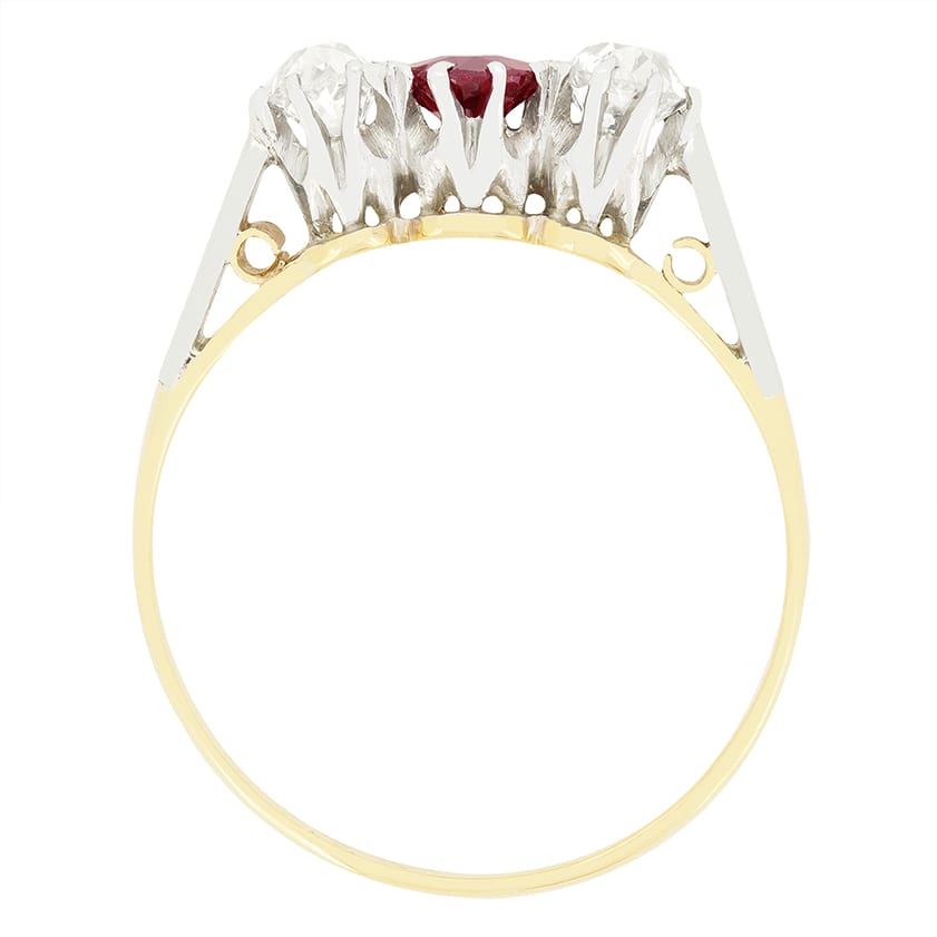 This wonderful Edwardian trilogy ring features a vibrant red ruby at its centre, flanked by a pair of old cut diamonds. The ruby is a 0.30 carat, old cut stone. The two diamonds are 0.20 carat a piece, both matching in quality at G in colour and VS in clarity. All three stones have been claw set into a platinum mount, whilst the band has been crafted from contrasting 18 carat yellow gold.