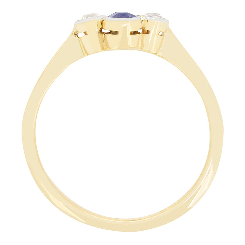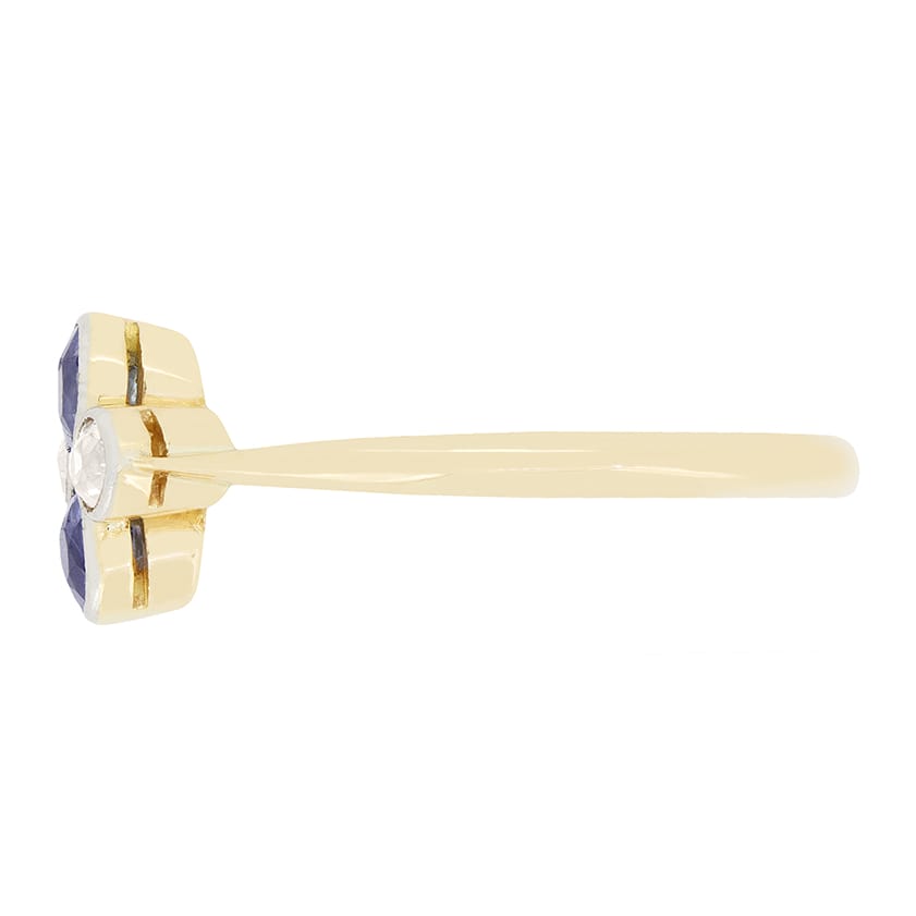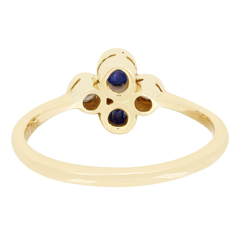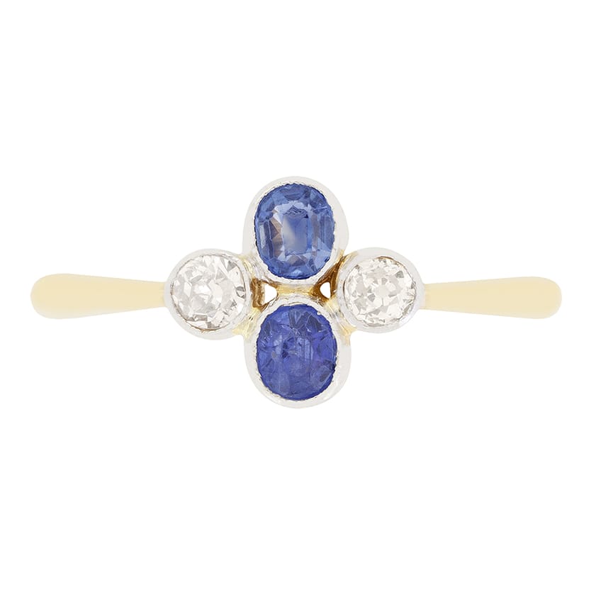 Dating to the Edwardian era comes this wonderful Sapphire and Diamond Cluster Ring. Set vertically, two 0.15 carat oval cut sapphires are rub over set, accompanied by two horizontally set old cut diamonds, each weighing 0.10 carat. These diamonds match perfectly in quality at H in colour and VS in clarity. The four gems are set in platinum and sit upon a contracting collet and band of 18 carat yellow gold, for a timeless dual metal look.