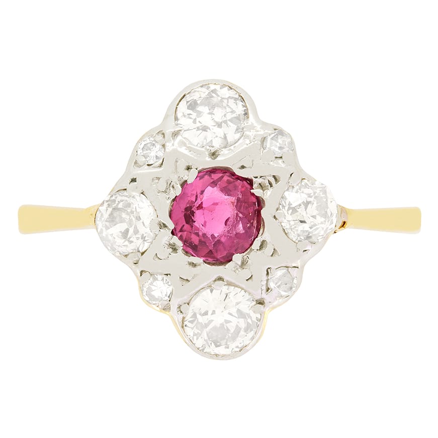 This lovely cluster ring dates back to the 1910s and showcases a light ruby at the centre, complemented by old cut diamonds. The old cut ruby weighs 0.40 carat and has been rub over set into platinum, along with the diamonds. The diamonds vary in size, with to the top and bottom each diamond weighing 0.20 carat, whilst the flanking pair weigh 0.15 carat, with four smaller diamonds set in between. All the diamonds match in quality at I in colour and VS in clarity. The platinum head sits on band of 18 carat yellow gold finishing off the ring beautifully.