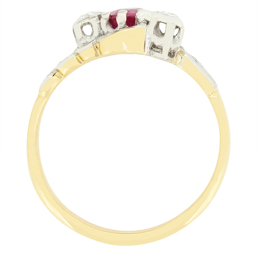 Edwardian 0.40ct Ruby and Diamond Three Stone Twist Ring, c.1910s