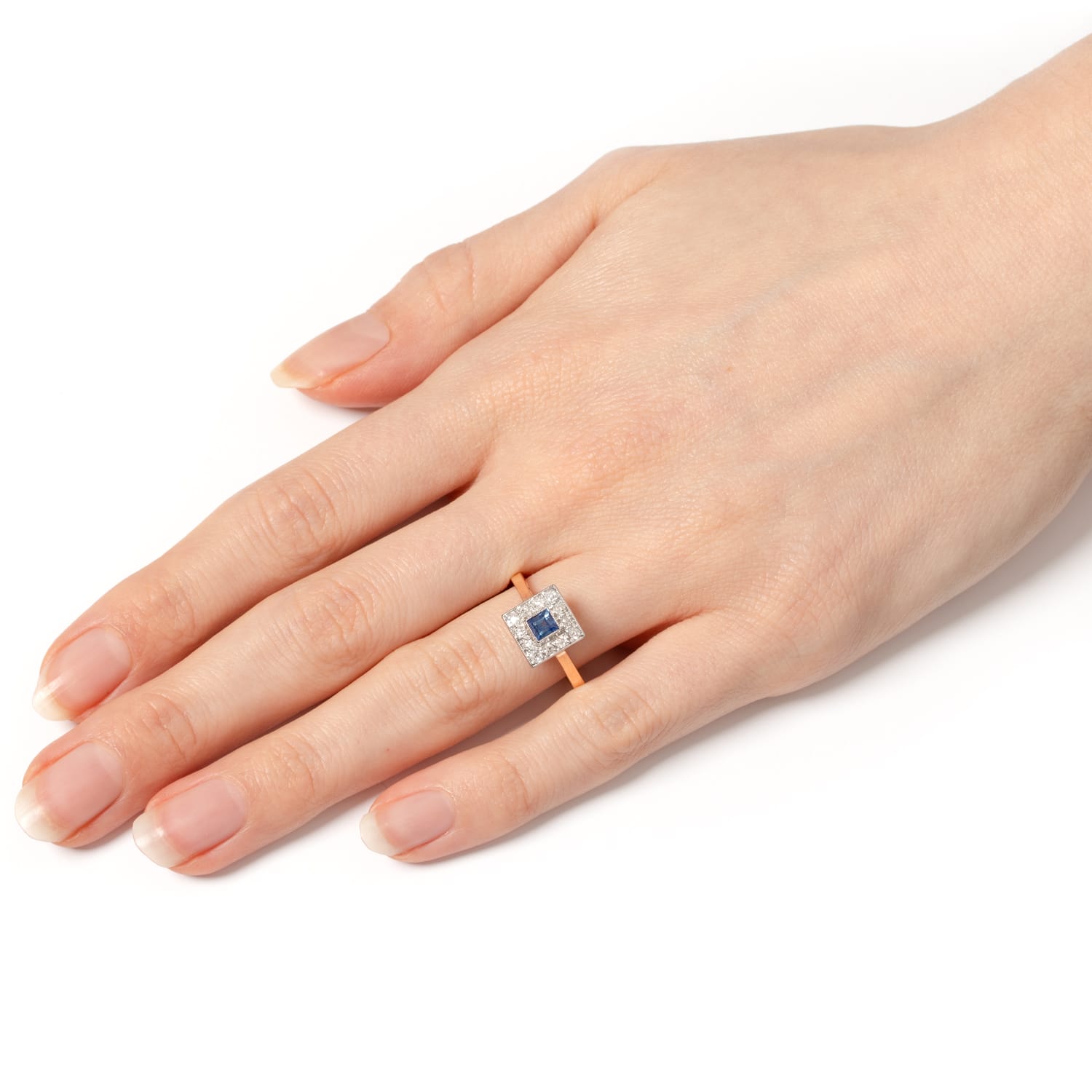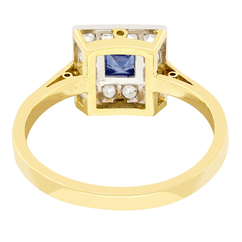 This lovely square cluster ring was hand crafted during the Edwardian period. A Carré cut Sapphire sits central to the design surrounded by a total of twelve old cut diamonds. The ocean blue sapphire weighs 0.40 carat and has been run over set into contrasting platinum. The diamonds total 0.60 carat and are also set into platinum, enhancing their already high colour grading of G and clarity of VS. This beautiful ring is finished with a square basket and band crafted from 18 carat yellow gold.
