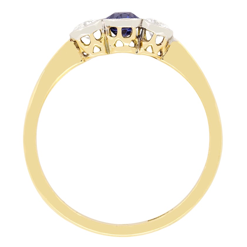 This delightful Edwardian trilogy ring features a deep blue sapphire flanked by a pair of old cut diamonds. The central sapphire is an old cut stone weighing 0.40 carat, whilst the two diamonds are 0.20 carat a piece. The diamonds match in quality at G in colour and VS in clarity. All three stones have been rub over set into a platinum mount which sits on a band of 18 carat yellow gold.