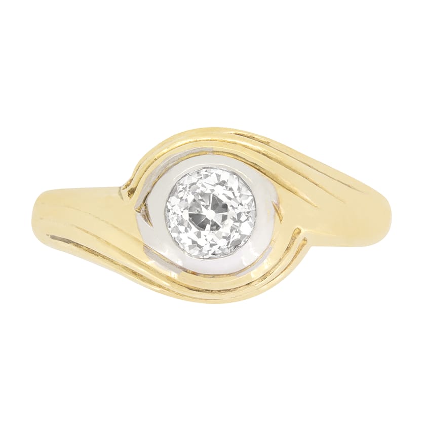 Dating back to the 1910s, this unusual solitaire ring features a single 0.45 carat, old mine cut diamond at it’s centre. Rub over set into platinum, the diamond has a colour of H and clarity of VS1. Swirling around the platinum setting, the hand crafted twist design band is made from contrasting 18 carat yellow gold and truly sets this ring apart with it’s unique shaping.