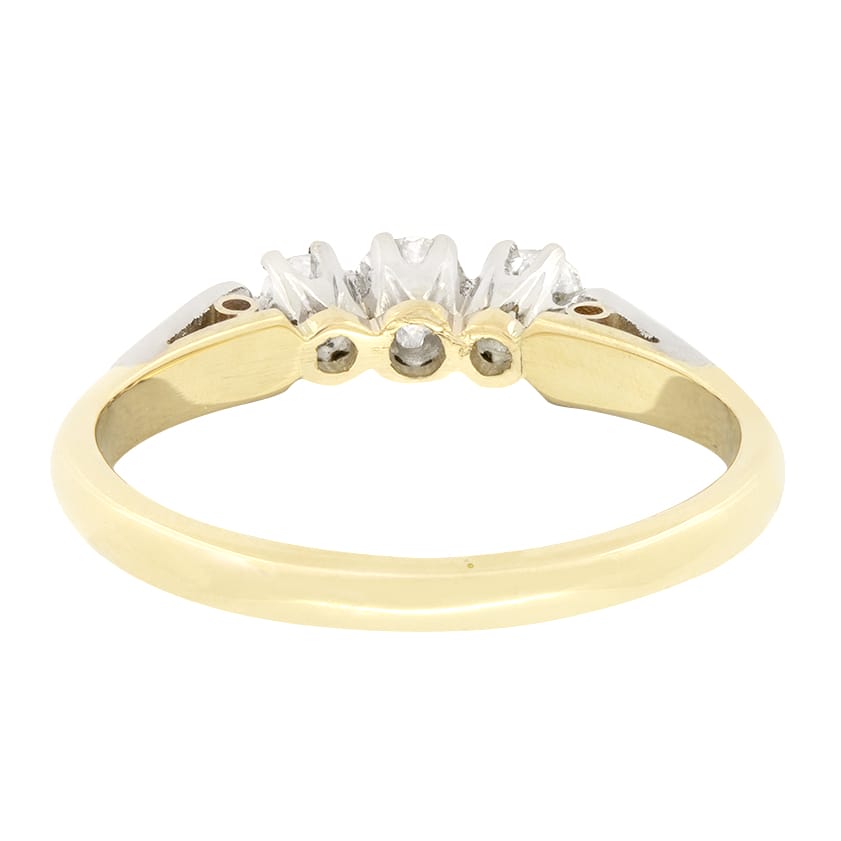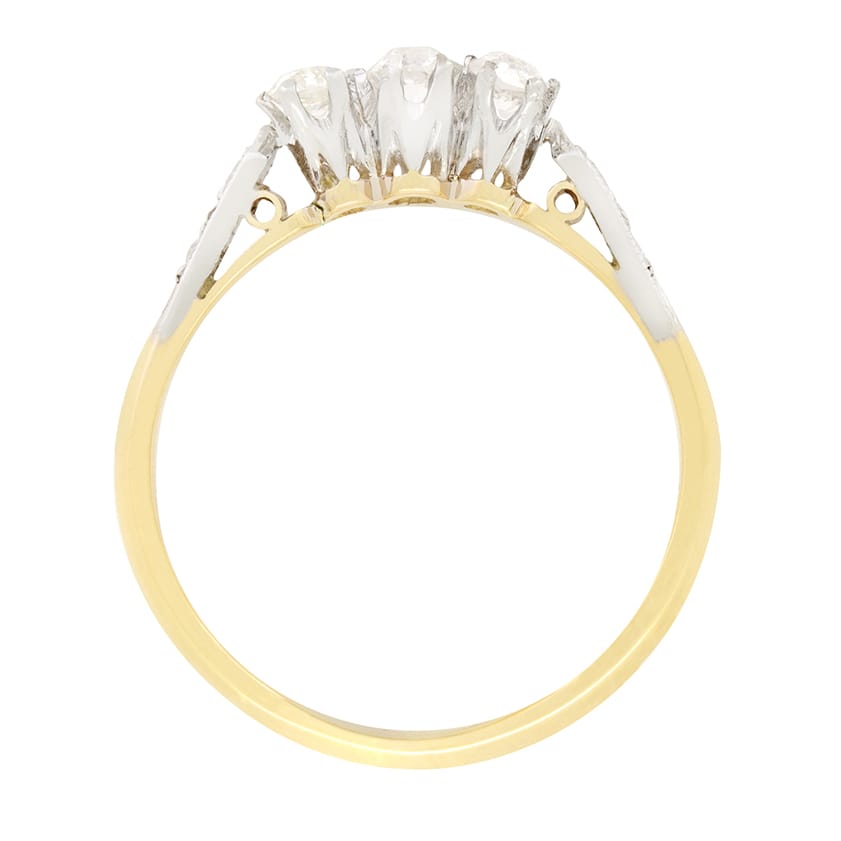 Dating back to the 1910s, this wonderful Edwardian trilogy ring features a trio of old cut diamonds as its centrepiece. Each diamond weighs 0.15 carats, and is delicately set into platinum claws. The three diamonds range in colour from H to I, whilst matching in clarity at SI. The platinum shoulders are adorned with an additional 0.06 carats of diamonds, further enriching the ring’s sparkle. The band, crafted from 18 carat yellow gold, provides a beautiful contrast to the platinum in this classic Edwardian three stone design.