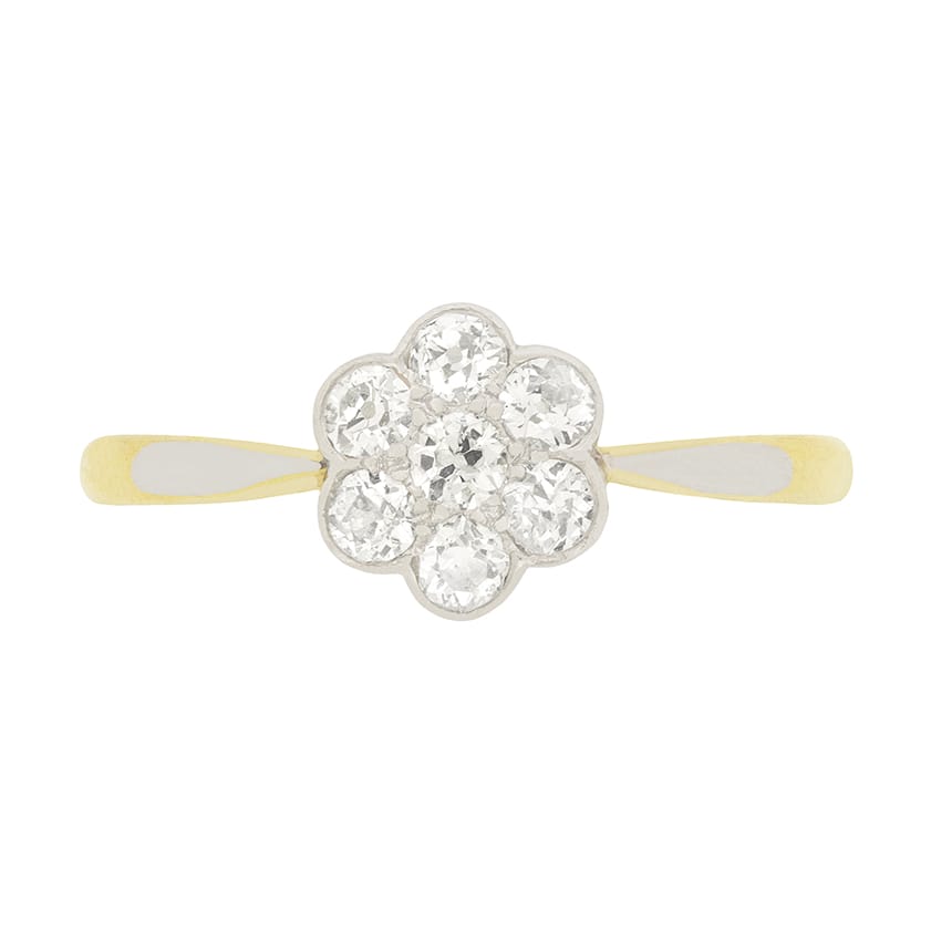 This sweet Edwardian daisy ring is adorned with old cut diamonds. The centre diamond is 0.08 carat, and the surrounding diamonds are 0.07 carat each. The diamonds match for quality, with colour grades of F and clarity grades of VS. They are set in platinum, which also lines the shoulders of the ring. The band is made of 18 carat yellow gold. In this time, daisies were a popular motif to symbolise the purity of love, or were given to congratulate new mothers.