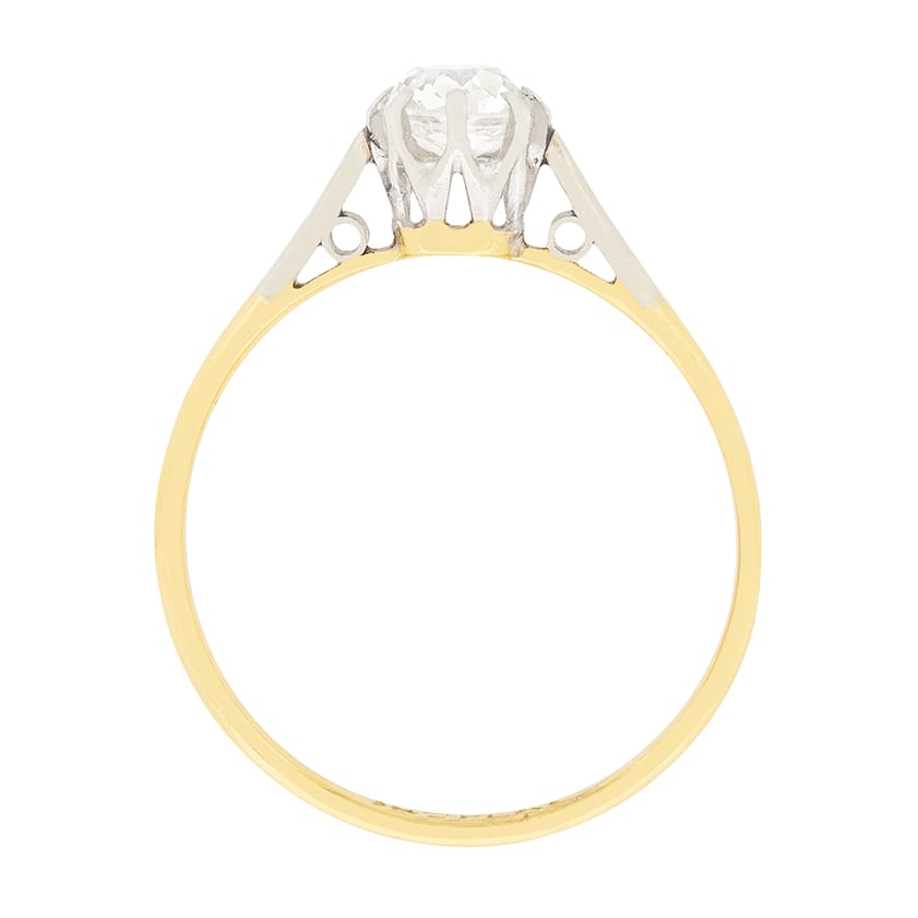 This gorgeous Edwardian engagement ring features a stunning 0.50 carat diamond. The diamond is old cushion cut, and is H colour and VS1 clarity. It is held within eight platinum claws, accenting the white colour of the diamond. Platinum extends onto the shoulders, which transitions to a smooth 18 carat yellow gold band. The entire ring would have been made by hand in the 1910s.
