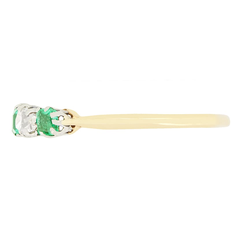 Three characterful emeralds are separated by old cut diamonds in this wonderful Edwardian ring. The centre Emerald is 0.20 carat, with each side emerald sitting at 0.15 carat each. The diamonds are also 0.15 carat a piece with matching colour of G and clarity of VS2. The gems are held within platinum claws, whilst the band is made from contrasting 18 carat yellow gold.
