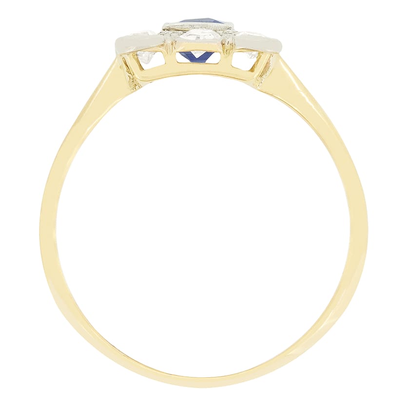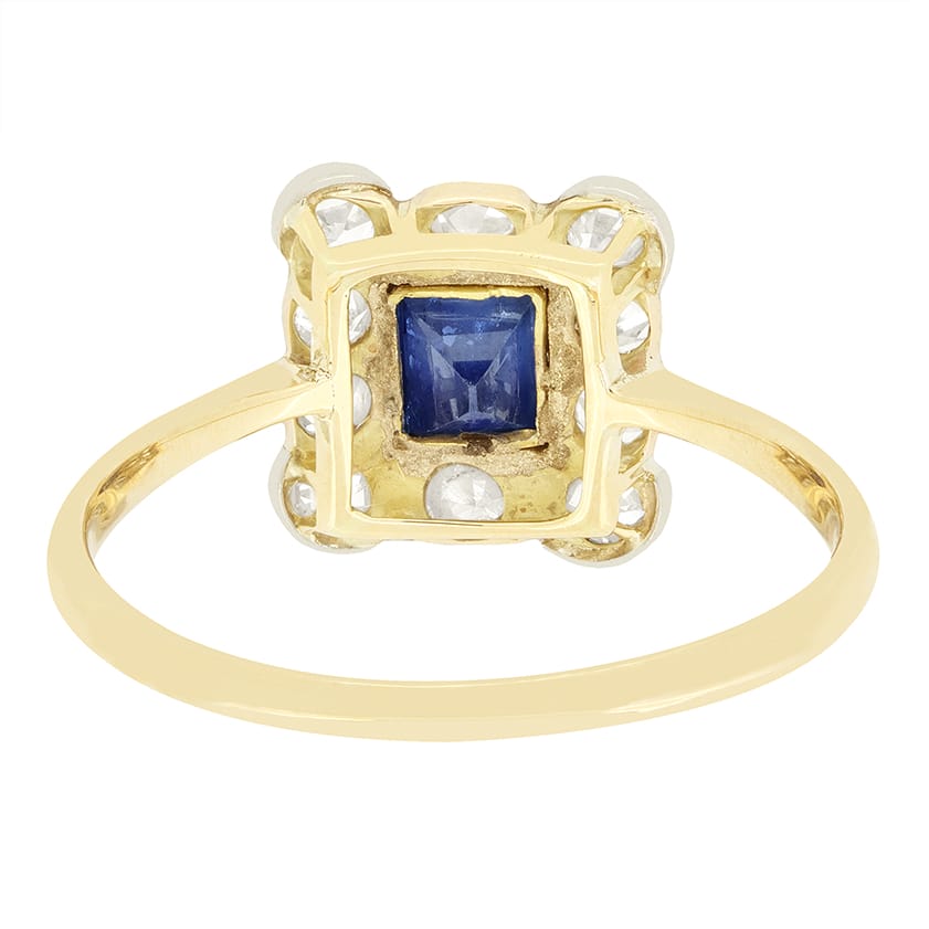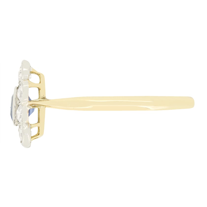 This beautiful Edwardian cluster ring features a pale blue sapphire at its centre. The 0.50 carat sapphire is a baguette cut gem, elegantly rub over set, and surrounded by a total of 0.50 carat of eight cut diamonds. The diamonds all match in quality at G in colour and VS in clarity, creating a stunning rectangle cluster halo effect. The diamonds and sapphire are all set into a platinum head, whilst the basket and band are crafted from 18 carat yellow gold, creating a wonderful contrast and timeless appeal.