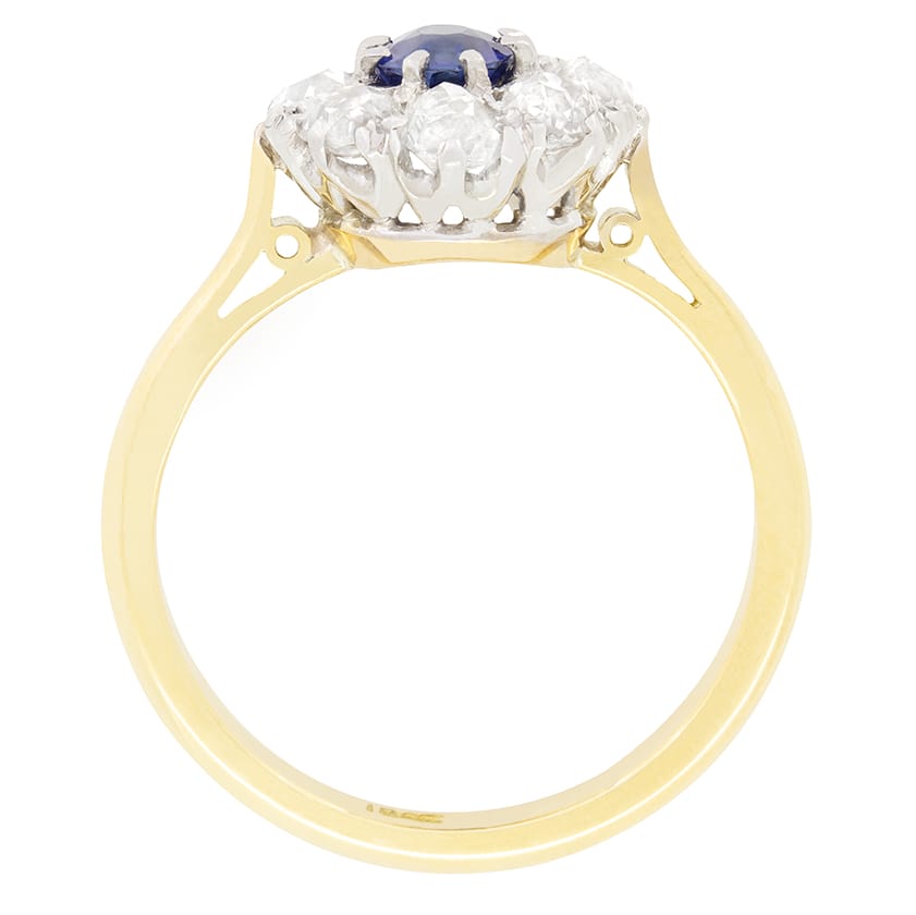 A vibrant blue Sapphire is the focal point of this Edwardian cluster ring. The Sapphires is an old cut stone with a carat weight of 0.50 carat. Enveloping the central stone is a halo of sparkling old cut diamonds. Each of the diamonds weigh 0.15 carat a piece and that have been estimated at G to H in colour and VS to SI in clarity. The head of the ring has been hand crafted from platinum and finished with a band of 18 carat yellow gold.