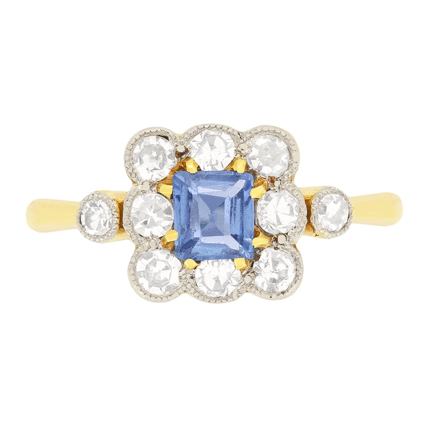 This unique cluster ring dates back to the Edwardian era. A gorgeous cornflower blue sapphire sits central to the piece. The sapphire is an emerald cut stone and weighs 0.50 carat. It is claw set in 18 carat yellow gold. Surrounding the sapphire is a square halo of diamonds. These are set into platinum really helping the white stones sparkle. There is then a further two diamonds on each of the rings shoulders. The diamonds total 0.50 carat and match in quality, being graded G in colour and VS in clarity. The gallery and band are all hand crafted from 18 carat yellow gold.