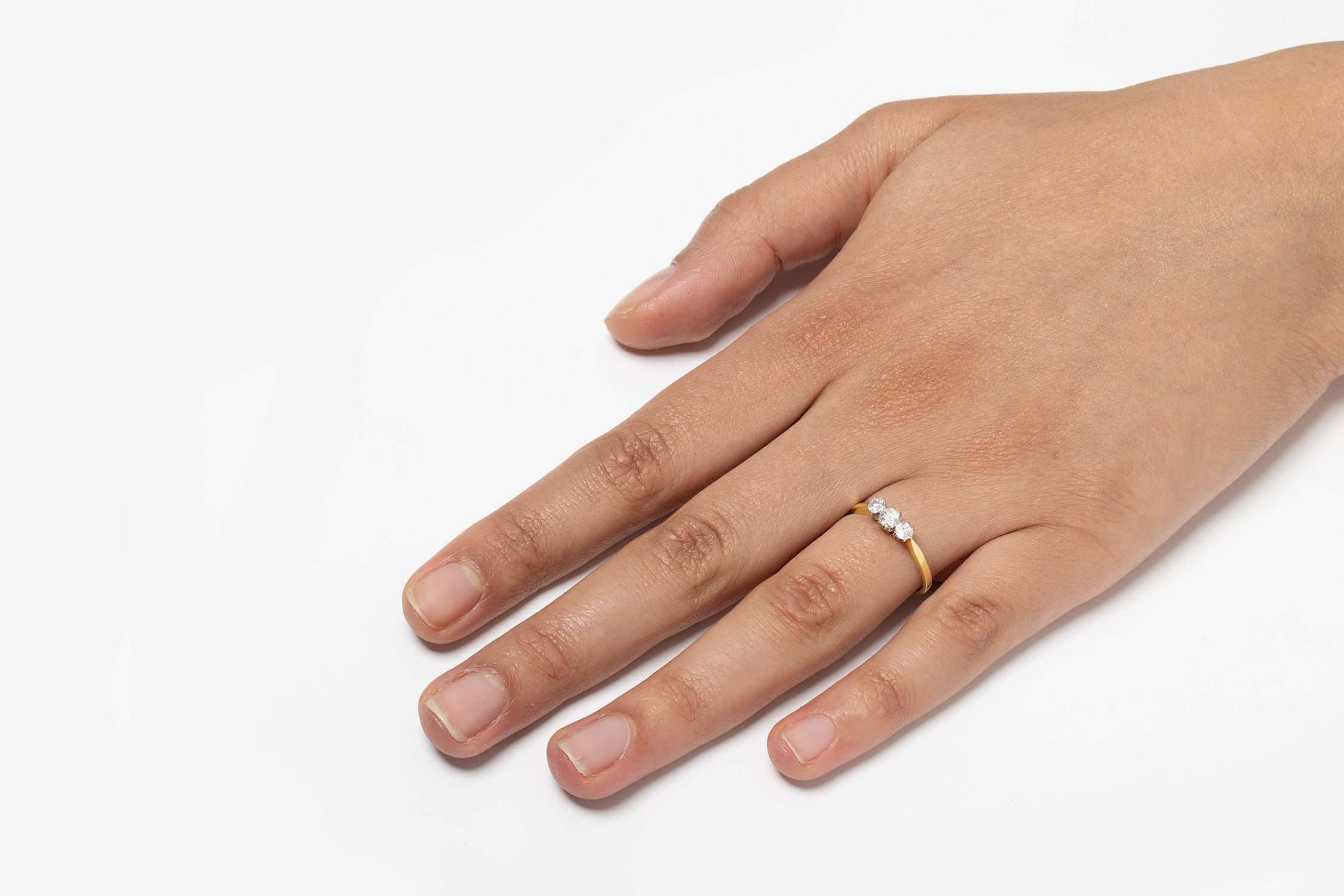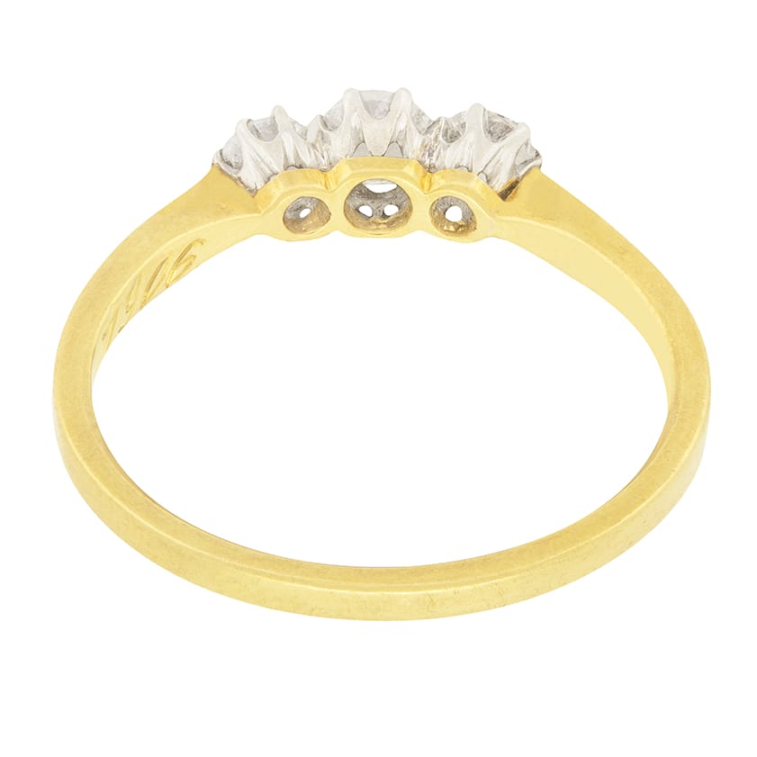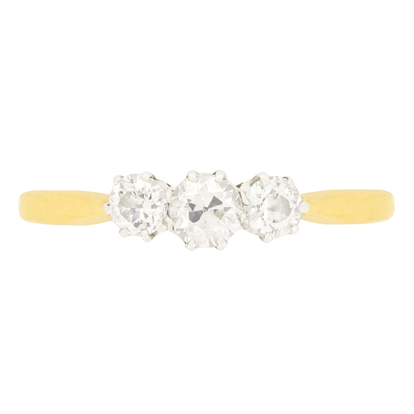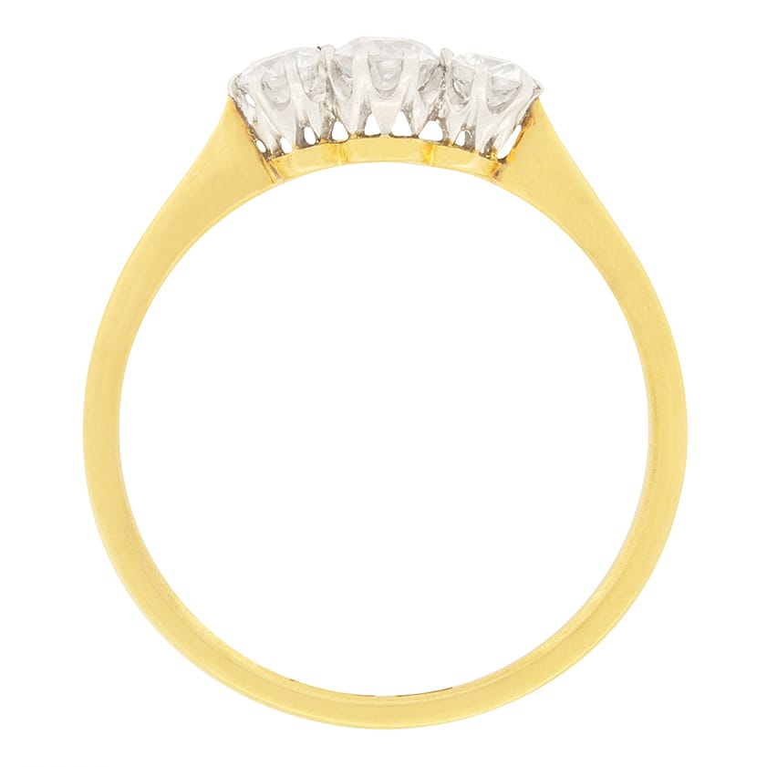 Three old cut diamonds are on display in this sweet trilogy ring from the Edwardian era. In the centre sits the largest of the trio, weighing 0.25 carat, with the diamonds at either end being 0.15 carat each. They have been estimated as H in colour and VS in clarity. All three diamonds have been set into a platinum collet, which blends into a slim and elegant band, hand crafted in 18 carat yellow gold.
