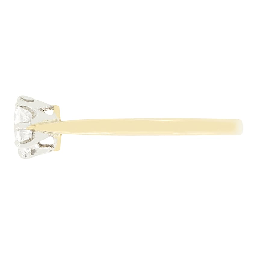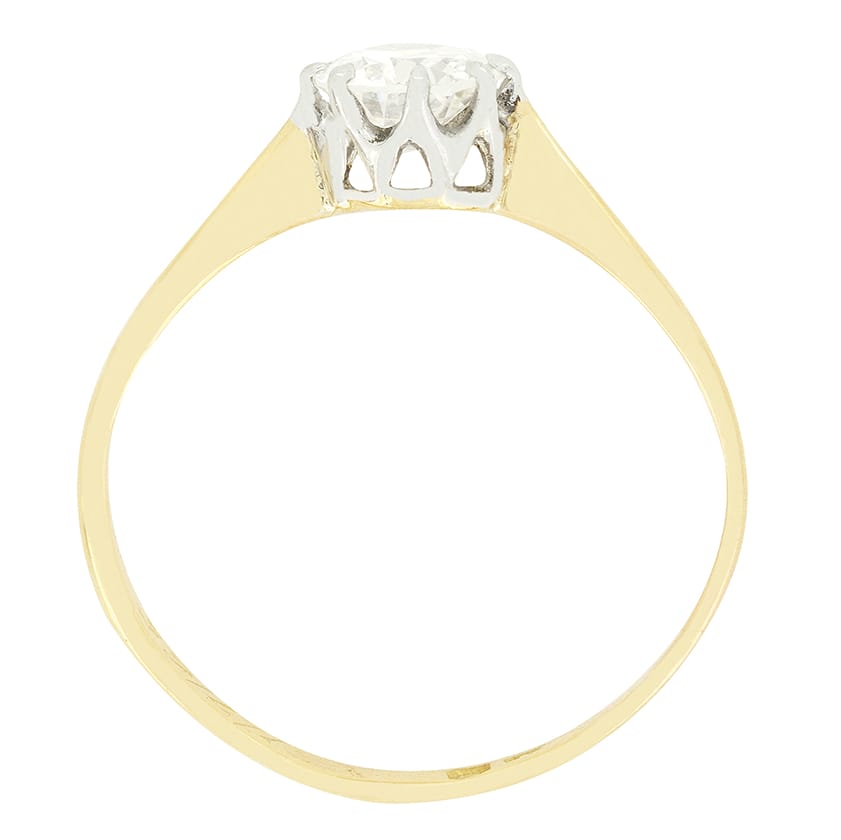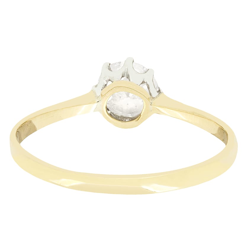 This classic solitaire ring dates to the Edwardian era. A single 0.58 carat old cut diamond takes centre stage. The diamond has a colour of H and clarity of SI1. It has been elegantly claw set into a platinum collet, with a contrasting band of 18 carat yellow gold completing this quintessentially Edwardian solitaire ring.