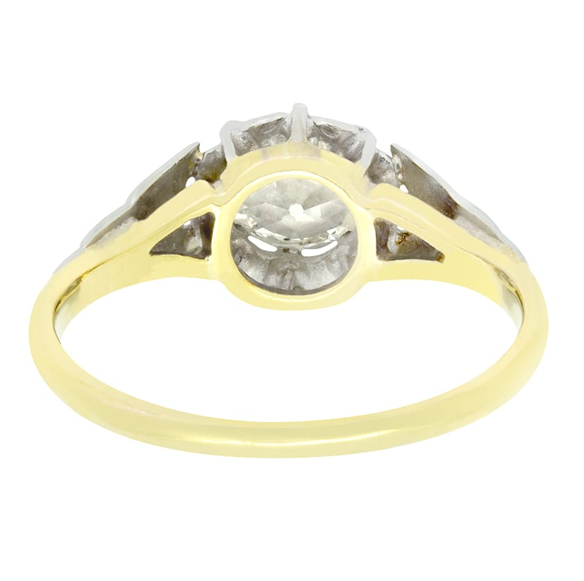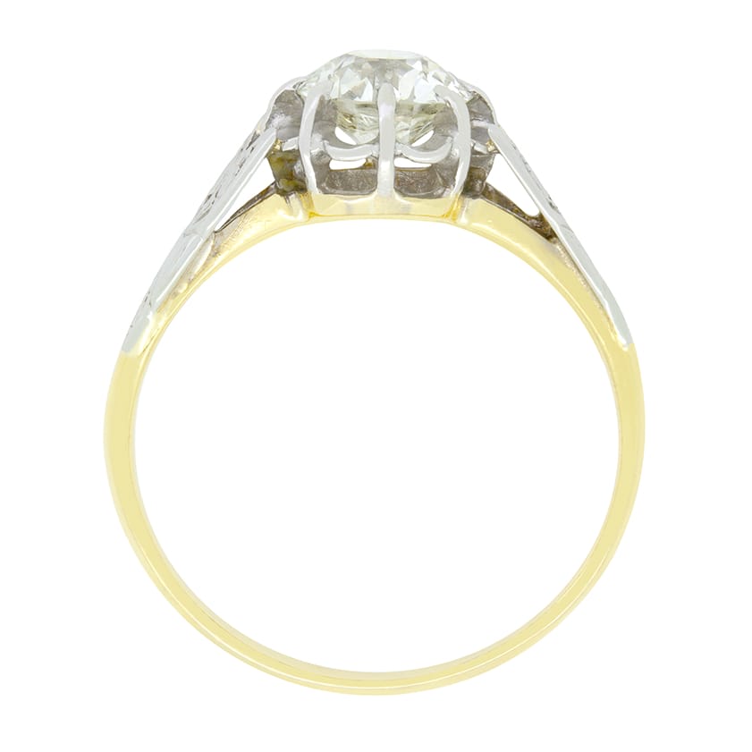 A beautiful old cut diamond takes centre stage in this Edwardian solitaire ring. The diamond is 0.75 carat with colour of H colour and clarity of SI1. Claw set within a beautiful platinum illusion setting the diamond is flanked by decorative carved shoulders. A contrasting band of 18 carat yellow gold completes the ring in classic Edwardian fashion.