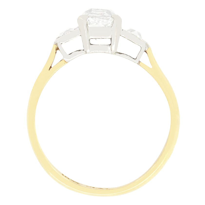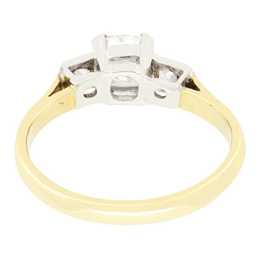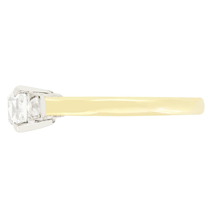 This wonderful Edwardian trilogy ring features a 0.75ct old mine cut diamond, skilfully claw set in platinum. The stepped shoulders boast two further old cut diamonds, 0.10ct each, set in box settings. All diamonds have been graded H to I in colour and VS in clarity. The ring is finished with a band crafted from 18 carat yellow gold. This piece showcases a unique take on the timeless three stone design.