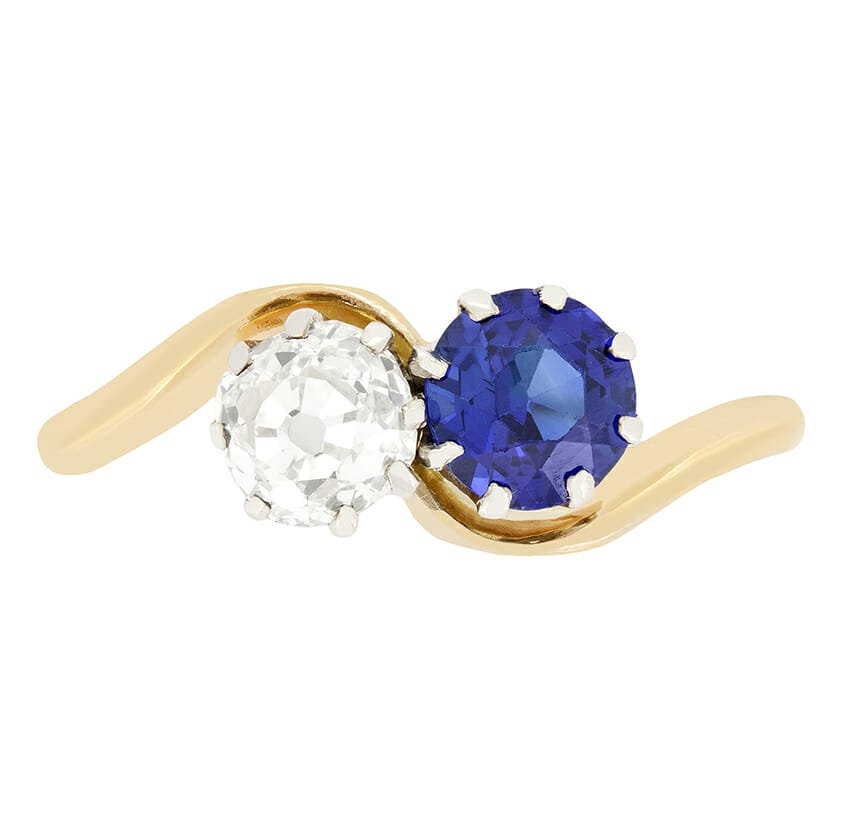 Dating back to the Edwardian era is this two stone twist. It features two 0.75 carat gem stones, claw set into a platinum head. The first stone is an old mine cut diamond. This characterful stone has been given a grading of I in colour and VS1 in clarity. The second stone is a bright blue sapphire which is completely natural and unheated. The shoulders elegantly curve around the setting work and into the band of 18 carat yellow gold.
