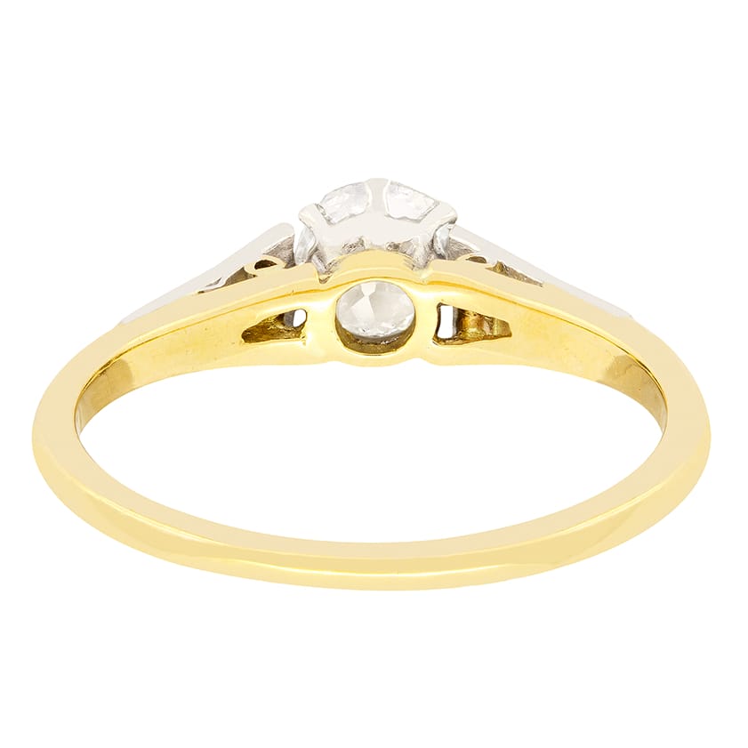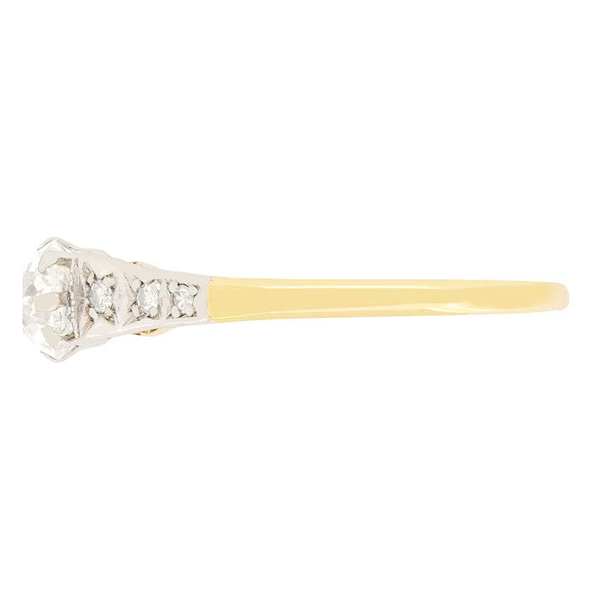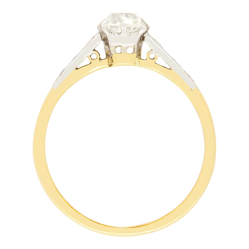 This exquisite Edwardian solitaire ring centres around stunning old cushion cut, 0.80 carat, diamond. The claw set diamond has a colour of J and clarity of VS1. Flowing down from this central diamond each shoulder is embellished with three diamonds, totalling 0.03 carat per shoulder. The setting work and shoulders of this beautiful piece are crafted in platinum, whilst the band is of 18 carat yellow gold. The contrasting metals being a distinctive style of the era.