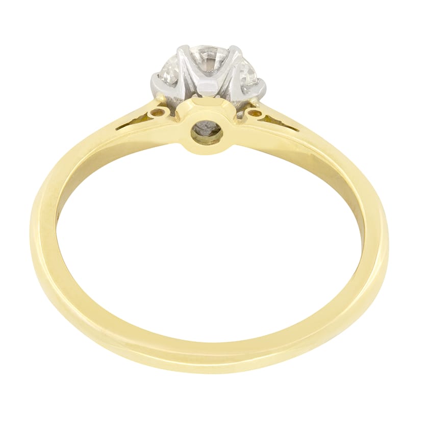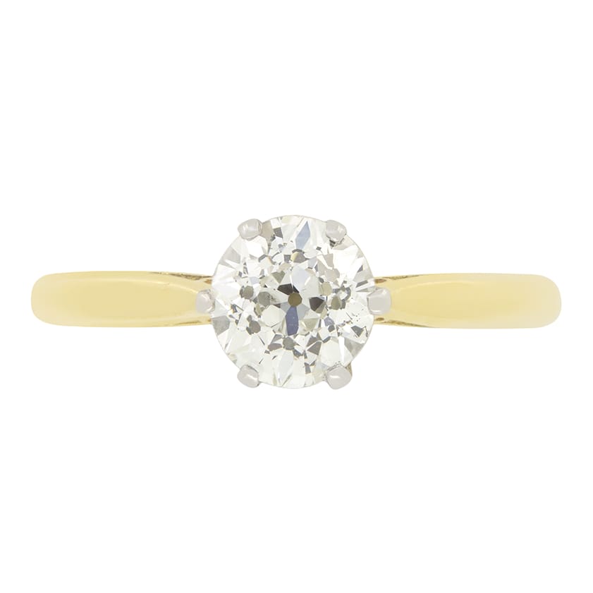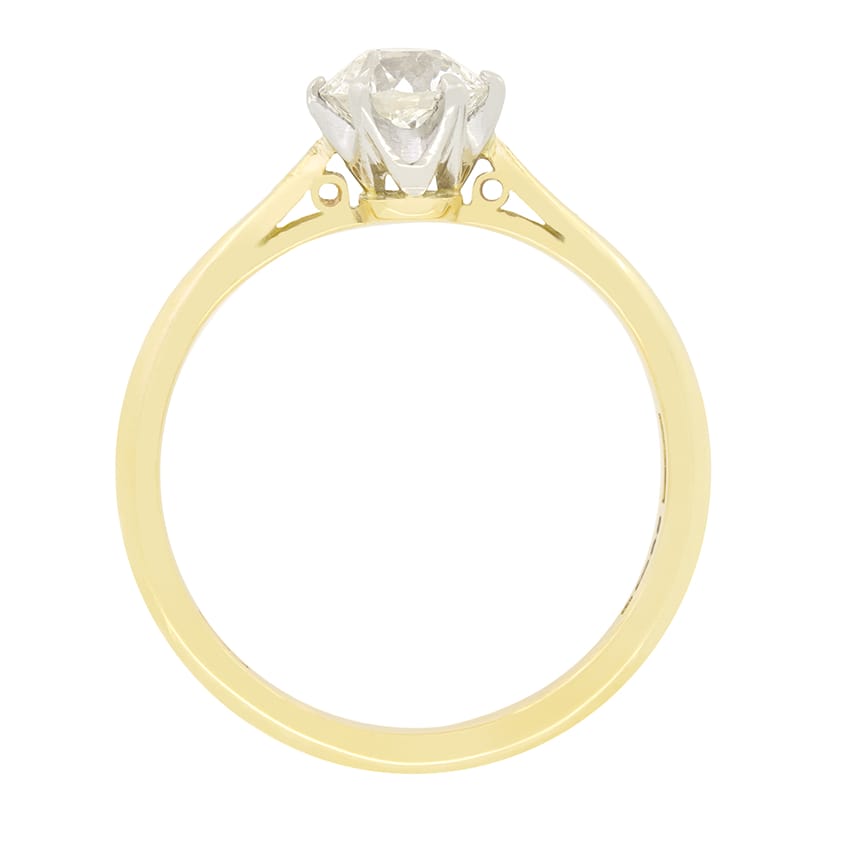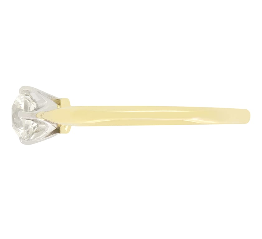 Hand crafted in the Edwardian era, this timeless solitaire ring features a single old cut diamond as its centrepiece. The 0.80 carat diamond is of high quality with a colour of G and clarity of VS1. Claw set into a platinum collet on a band of 18 carat yellow gold, this wonderful solitaire is a classic design and the most quintessential engagement ring style.