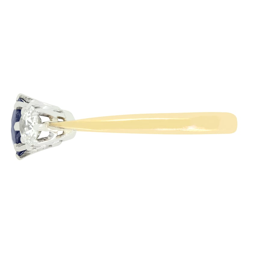 This stunning Edwardian three stone ring features a natural blue Sapphire at it’s centre, flanked by a pair of old cut diamonds. The sapphire is a 0.85 carat, unheated old cut stone. The two diamonds are 0.35 carat a piece and match in quality at G in colour and VS2 in clarity. All three stones have been claw set into handcrafted platinum collets whilst the band has been crafted from contrasting 18 carat yellow gold.