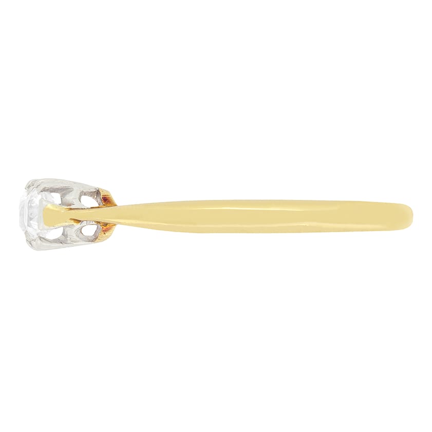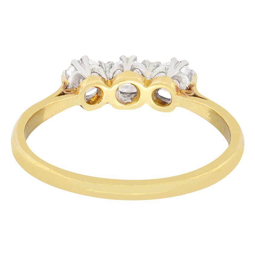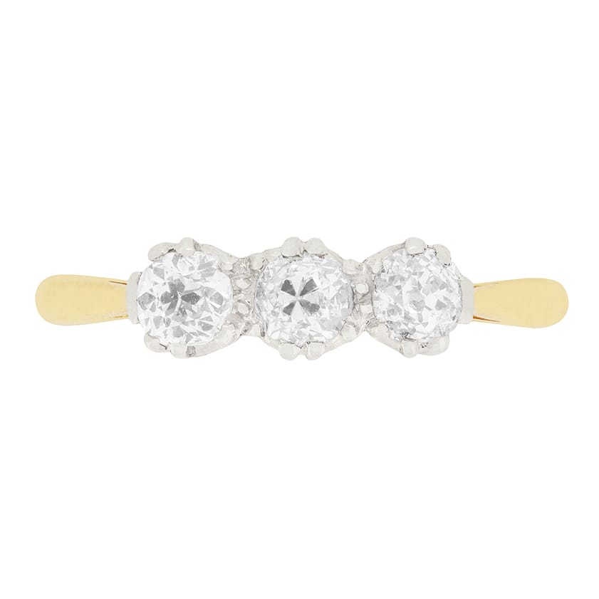 An Edwardian trilogy ring set with matching old cut diamonds. The three diamonds have a combined weight of 0.90 carat and have been estimated as G in colour and VS2 in clarity. They are all set within platinum collets that are attached to an 18ct yellow gold plain band.