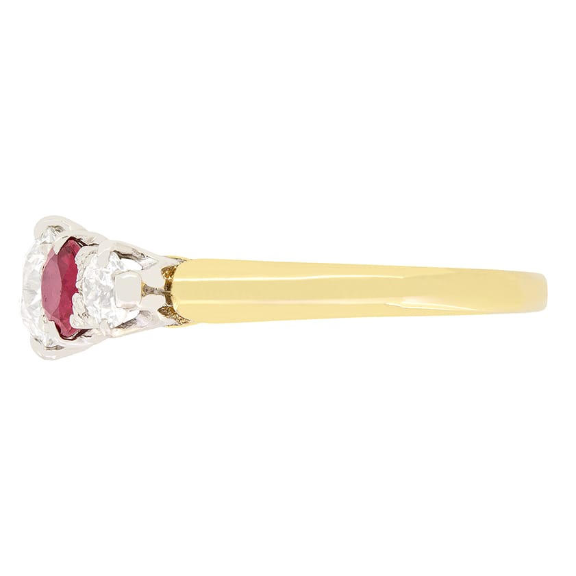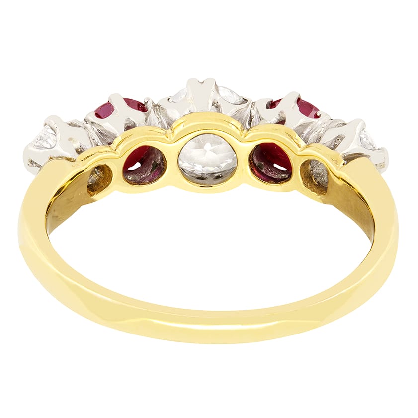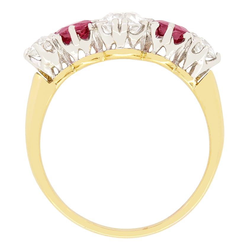 Dating back to the Edwardian era this five stone alternates between glistening diamonds and vibrant rubies. The biggest diamond is at the centre weighing 0.65 carat, with two smaller 0.15 carat stones at either end. All three diamonds are high quality old cuts with colour ranging from F to g and a clarity of VS. In between are a pair of old cut rubies, one either side the central diamonds, with each ruby being 0.30 carat a piece. Each gem has been firmly claw set into platinum collets, with a gently tapered band of 18 carat yellow gold completing the ring.