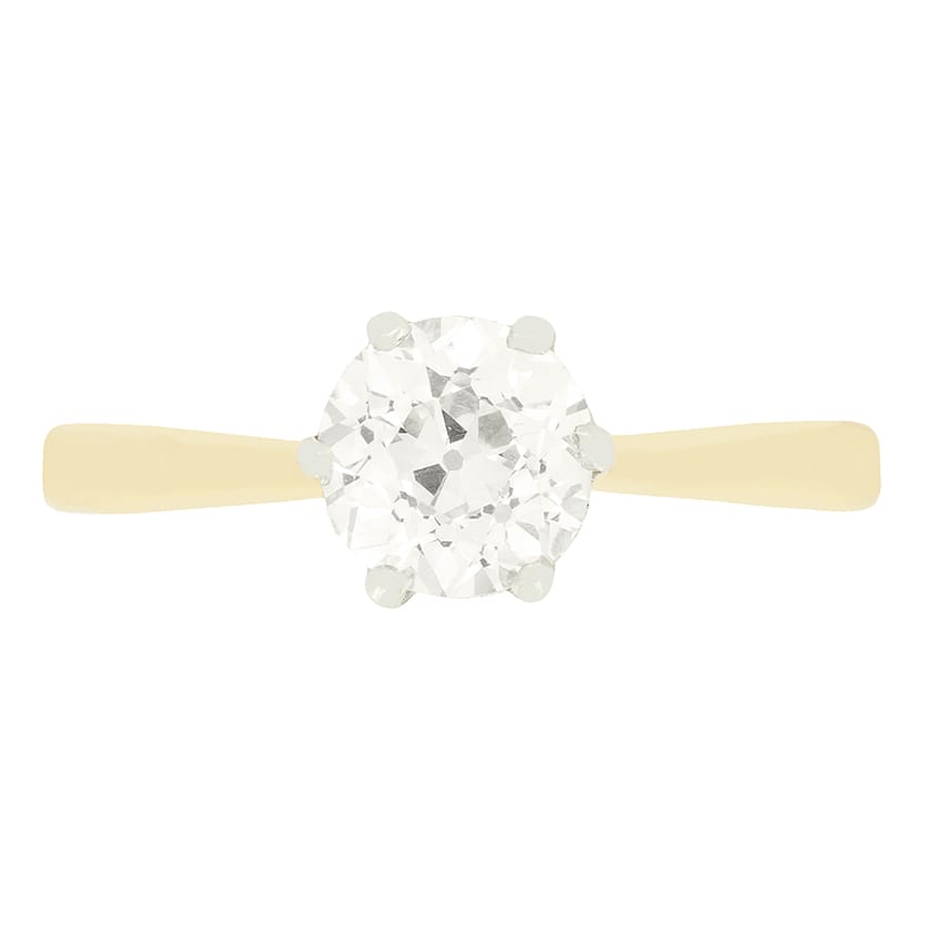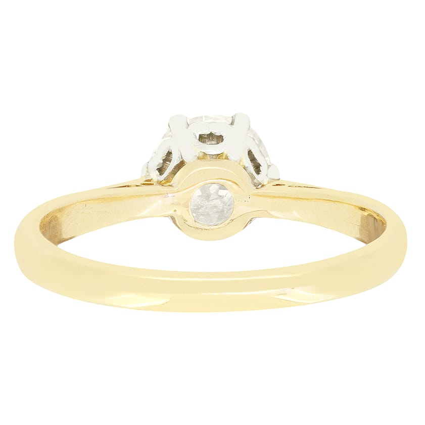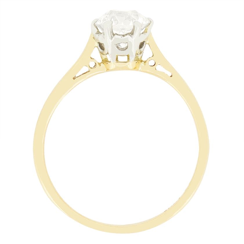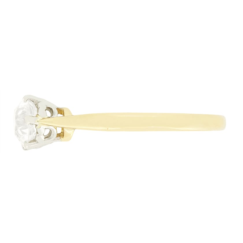 Dating back to the 1910s, this beautiful solitaire ring is timelessly elegant. The central stone is a sparkling 0.95 carat old cut diamond. The diamond is G in colour and VS1 in clarity and is claw set securely within an open platinum collet. Completing the piece is a simple contrasting band of 18 carat yellow gold, a classic of Edwardian jewellery design.