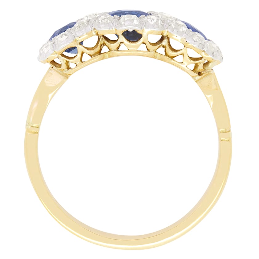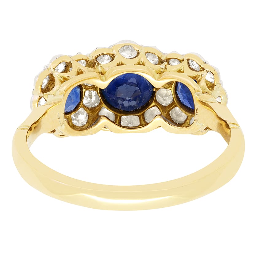 A stunning example of Edwardian craftsmanship, this exquisite trilogy halo ring showcases three vivid blue sapphires enrobed in old cut diamonds. The central sapphire sits the largest at 0.50 carat with the flanking pair at 0.30 carat a piece. Surrounding this trio, a triple halo of old cut diamonds are set for a total of 1.20 carat. Each sparkling diamond matching in colour at G and ranging from VS to SI clarity. The collection of stones have all been grain set within a platinum head, which sits upon a classically contrasting basket and band, elegantly hand crafted in 18 carat yellow gold.