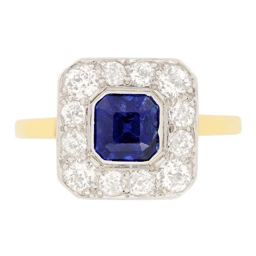 An enchanting deep blue, natural sapphire sits central to this cluster ring from the Edwardian era. The asscher cut sapphire weighs 1.30 carat and is rub over set into platinum. A total of 0.80 carat in old cut diamonds surrounds the central stone creating a beautiful contract between the rich blue and bright white. Each diamond matches in quality, being graded highly at F in colour and VS2 in clarity. A hand crafted basket and band of 18 carat yellow gold completes the ring perfectly.