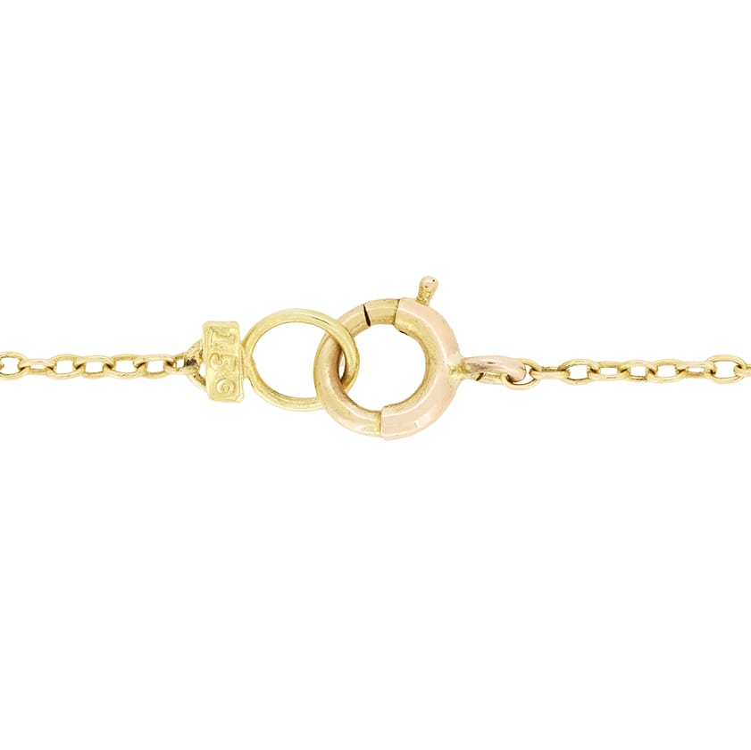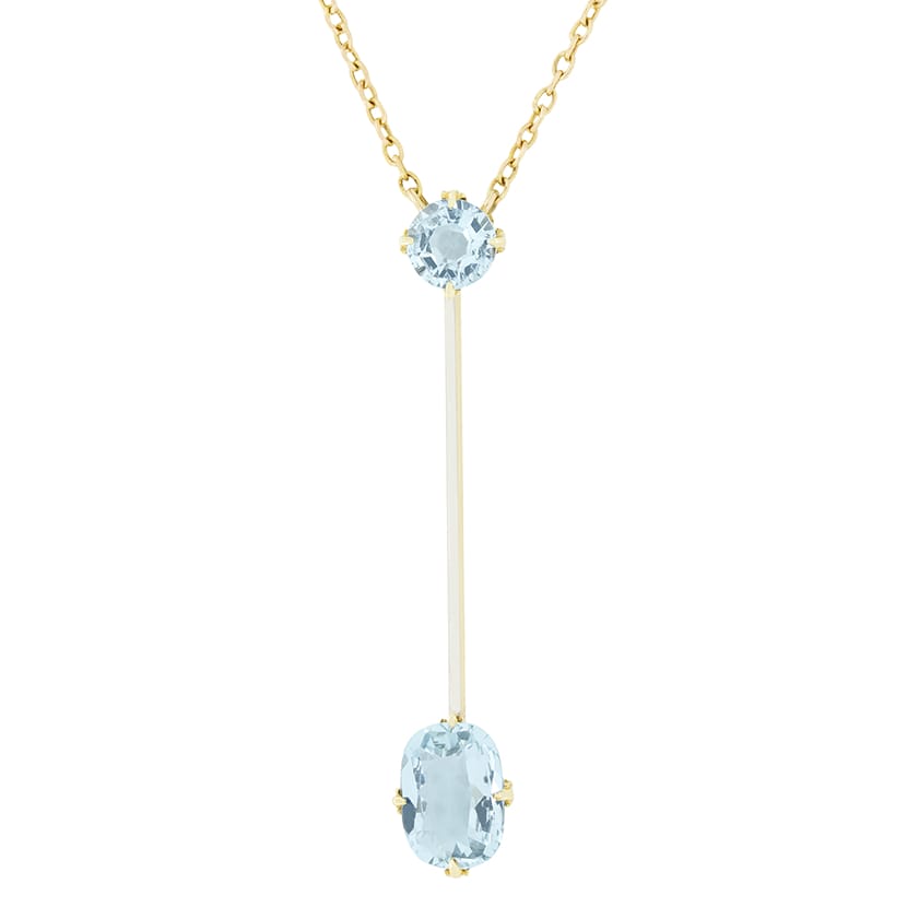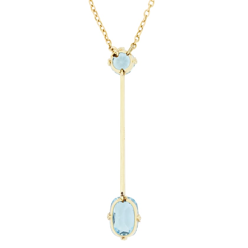 This charming drop pendant necklace dates to the 1910s. At the base of the drop sits a 1.00 carat oval cut aquamarine, with a slightly smaller 0.50 carat aqua at the top, and an elegant platinum topped bar linking the two gems. The pendant itself is crafted in 15 carat yellow gold and is suspended on an 18″ chain, making it incredibly wearable.