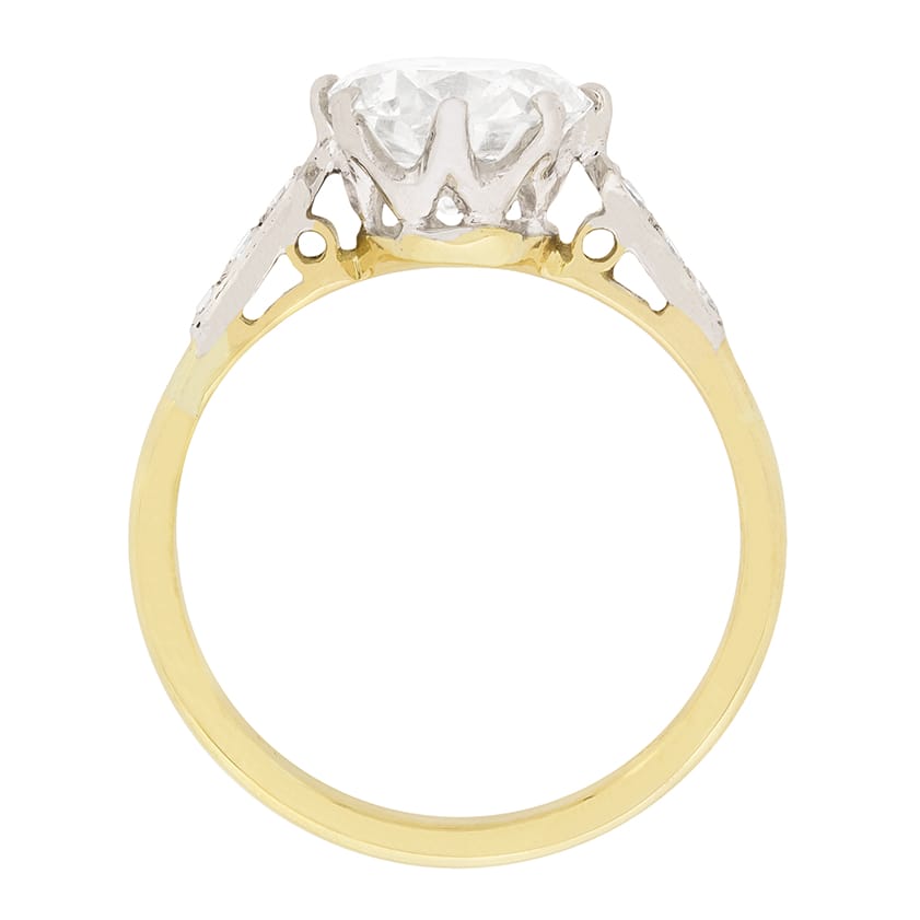This breath-taking engagement ring features a hand cut diamond weighing exactly 2.00 carat. The old cut diamond has been graded by EDR, and independent certification company, as H in colour and SI1 in clarity. The diamond is claw set within a handmade platinum collet and platinum shoulders. The shoulders are grain set with 8-cut diamonds which have a total weight of 0.12 carat. The shank is made form 18 carat yellow gold and the ring dates to c.1910.