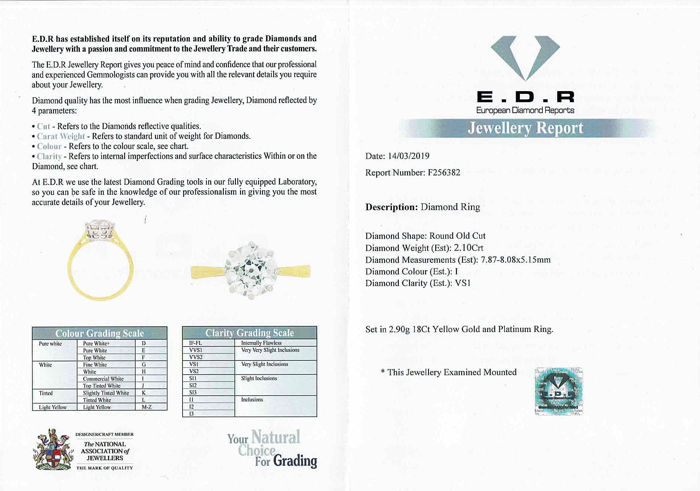 This classically stunning engagement ring features a 2.10 carat old cut diamond. The diamond has been certified by EDR, who have graded the sparkling stone as VS1 in clarity and I in colour. It has been claw set within a handmade platinum collet and finished with an 18 carat yellow gold shank. The ring is Edwardian and is a timeless design.