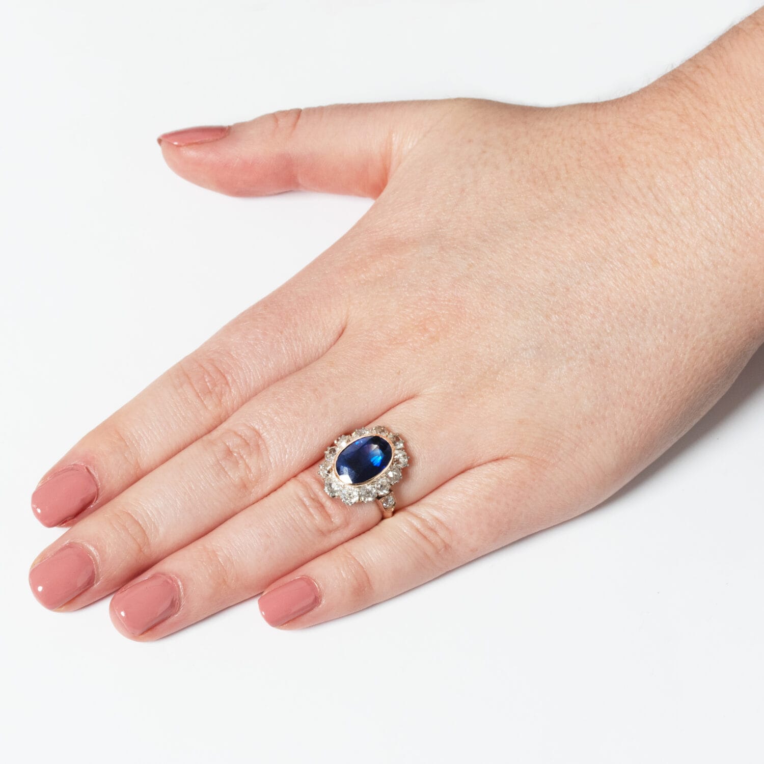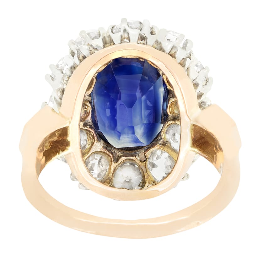 This jaw dropping cluster ring dates back to the 1910s. At it’s heart sits a beautiful oval cut Sapphire. The 4.80 carat stone is completely natural and unheated and is rub over set into contrasting 18 carat yellow gold. Enveloping the sapphire a ring of twelve old cut diamonds are set. Totalling 2.40 carat the diamonds match range in colour from H to I and in clarity from VS to SI. An additional diamond adorns the top of each shoulder, sitting at 0.10 carat and matching the others in quality. The hand crafted platinum head holding each diamond sits upon a band of 18 carat yellow gold completing the piece in classic Edwardian style.