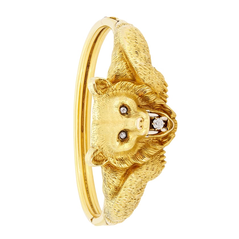 A one of a kind piece, this Edwardian bangle features an impressive bear motif. Hand crafted from 18 carat yellow gold, the intricate design includes old cut diamonds for detailing, a pair of 0.06 carat stones as the eyes and a single 0.25 carat diamond in the mouth. Each of the diamonds match in quality with a grading of G in colour and VS in clarity. The bangle has a circumference of 18 cm and sits on the wrist perfectly.