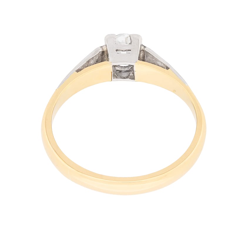 This simple and classic solitaire dates back to the Edwardian era. It features an old cut diamonds weighing 0.25 carat within a box setting made from platinum. It has been estimated as G in colour and VS2 in clarity. The shank has been made in 18 carat yellow gold, typical of the period. The shoulders are platinum and the ring is all handmade.