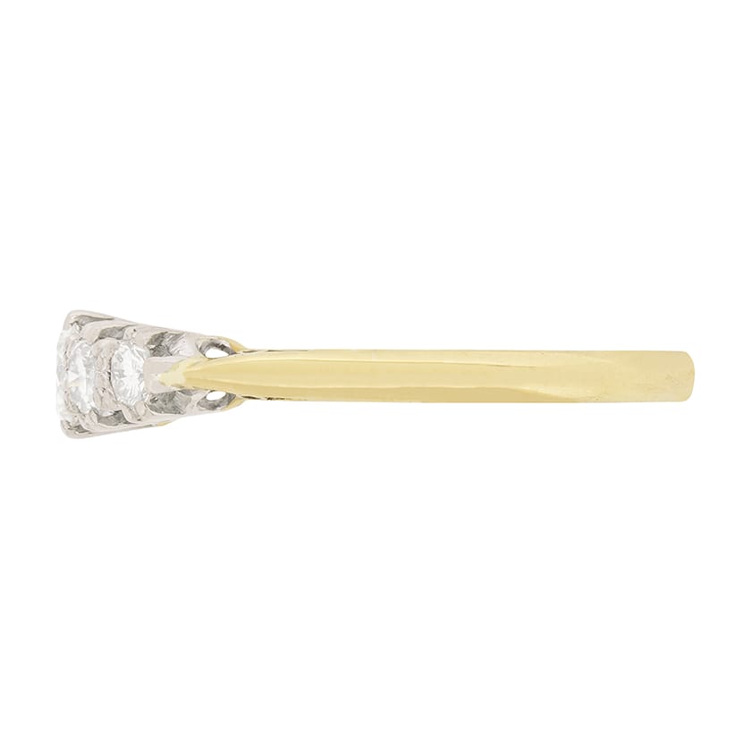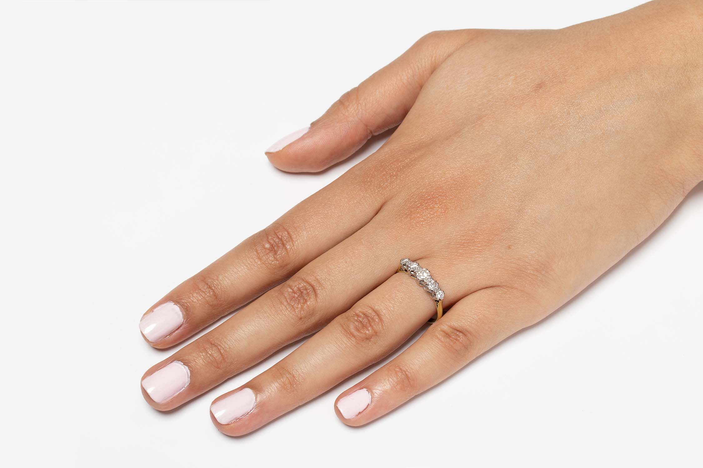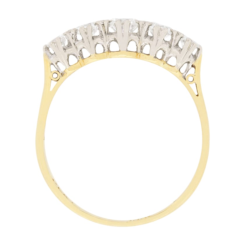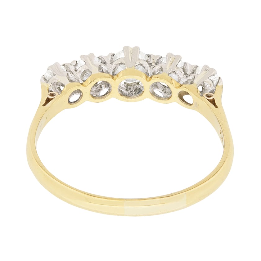 Dating to approximately 1910, this Edwardian ring features five transitional cut diamonds. The centre diamond is 0.35 carat, the two adjacent on either side weigh 0.20 carat, and the outermost stones each weighing 0.10 carat. The total weight is 0.95 carat. All the diamonds are claw set and match in quality; estimated as H in colour and VS in clarity. The setting work is open backed and made in platinum. The shank is made in 18 carat yellow gold, a typical feature of the era.