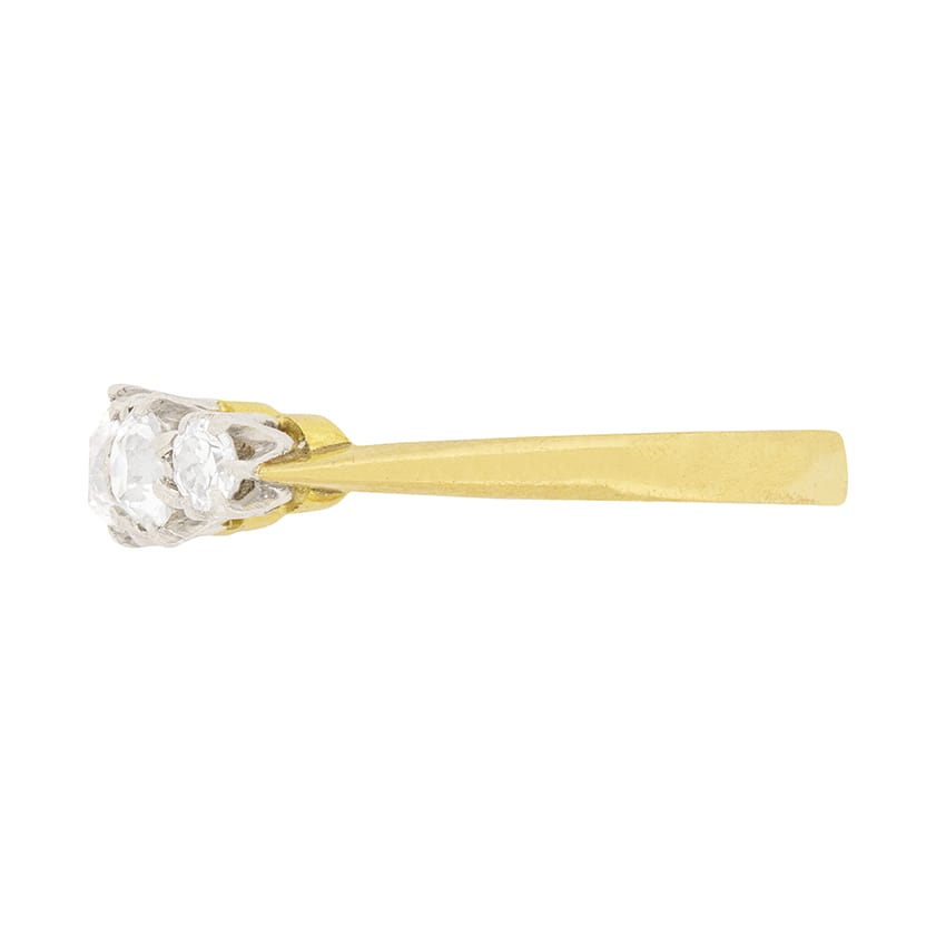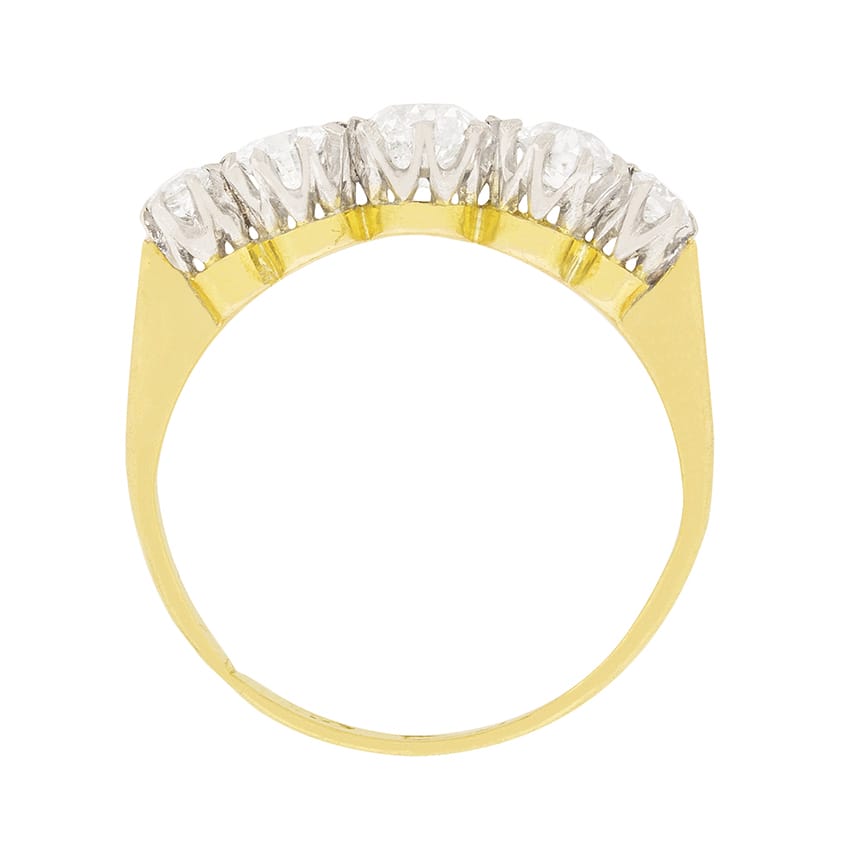 This beautiful five stone ring has a centre diamond weighing 0.35 carat and they graduate out in size. The two adjacent to the centre stone weigh 0.25 carat and each end diamond weighs 0.10 carat. This brings the total to 1.05 carat and all the diamonds are old cut stones. They are estimated as G to H in colour and SI in clarity. They have been set within platinum whilst the band has been made in 18 carat yellow gold. This is classic for the Edwardian period.