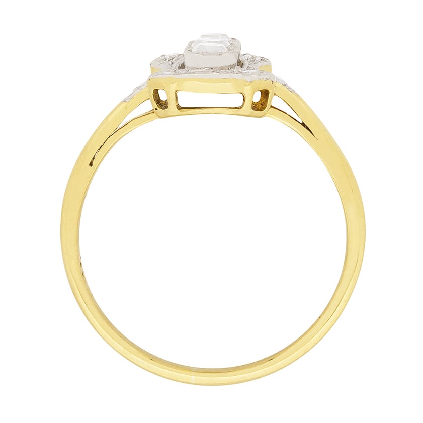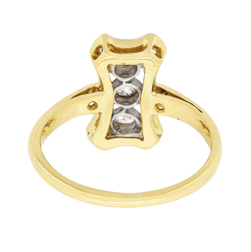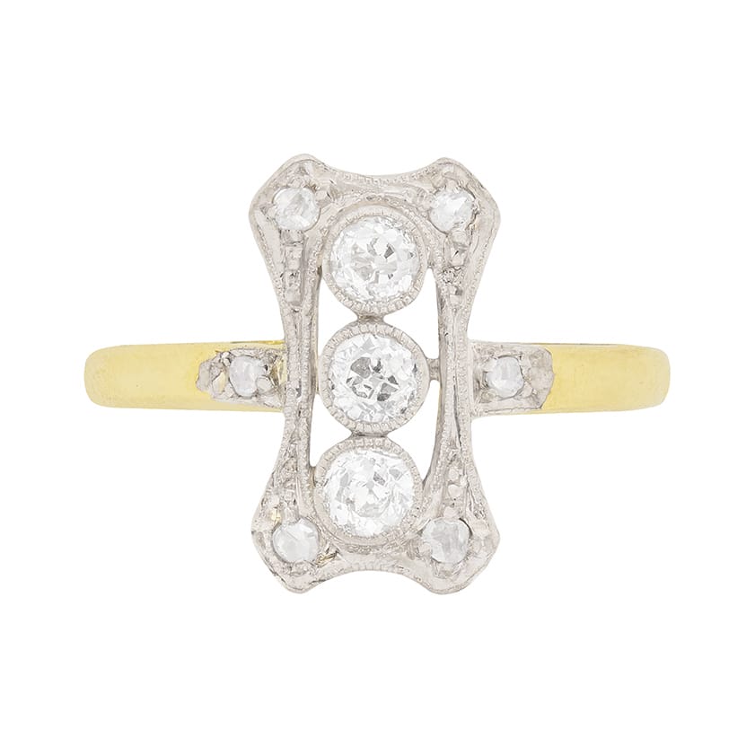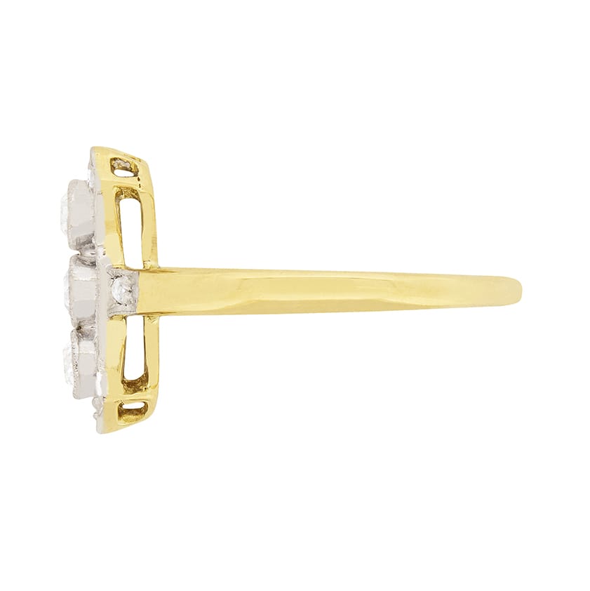 In the centre of this hand made cluster ring are three old cut stones, each weighing 0.10 carat. They are rub over set within platinum and are estimated as H in colour and SI in clarity. In the four corners of the rectangle halo surrounding the centre diamonds, are small rose cut diamonds, and there is one set on either shoulder. They each weigh 0.01 carat. The gallery and shank have been made in 18 carat yellow gold, a classic feature of the Edwardian period.