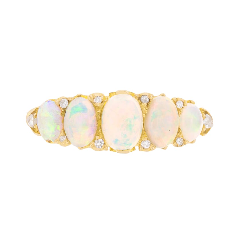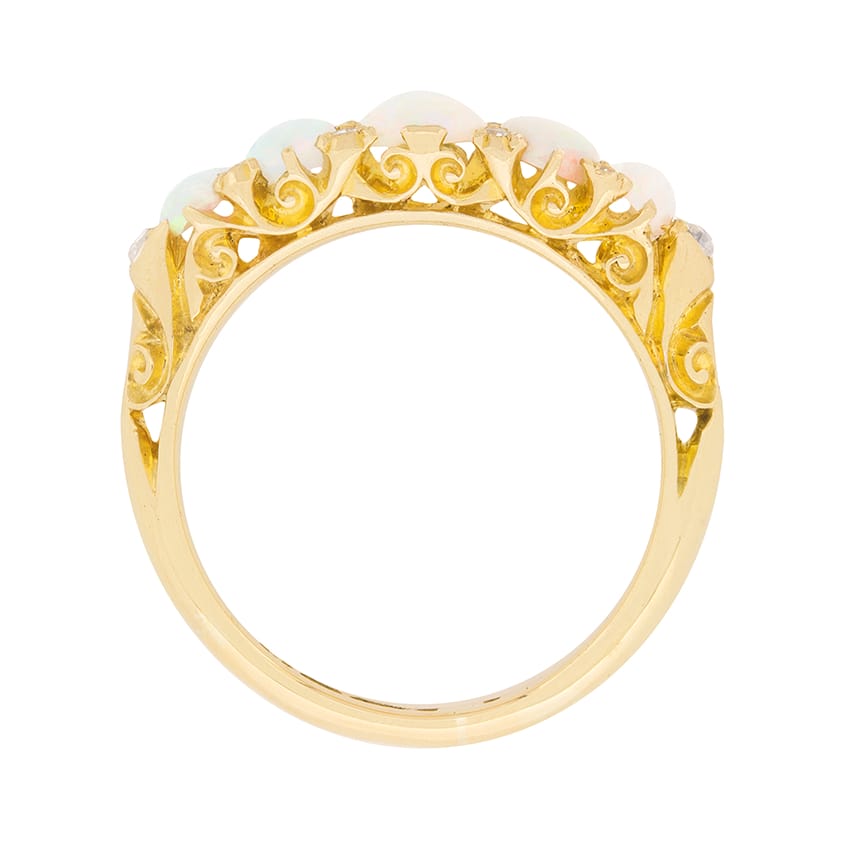 Dating to 1902, this stunning ring is made up of cabochon cut opals. The rainbow stones look beautiful within the 18 carat yellow gold claws. The total weight is 1.40 carat’s and in between each gemstone is a small rose cut diamond. The stones sit within a handcrafted carved shank, showing impeccable detailing and skill. The pattern continues into the shoulders adds real character to this wonderful piece of dress jewellery.