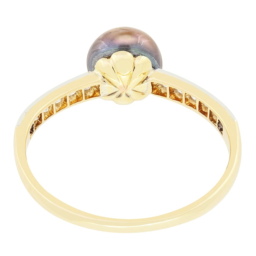 Dating to the Edwardian era, this wonderful solitaire ring centres around a single natural tahitian black pearl. The black pearl is certified as natural origin and untreated by the Gem and Pearl Lab, Certificate #26039, and is 7mm in width. Flanking the pearl, a total of 0.24 carat in old cut diamonds flow down the shoulders. These diamonds match in quality at H in colour and VS in clarity, with each grain claw set into platinum. The ring itself has been crafted by hand in 18 carat yellow gold.