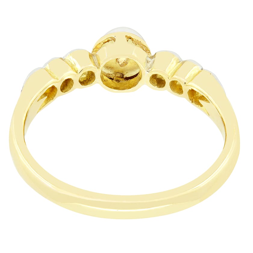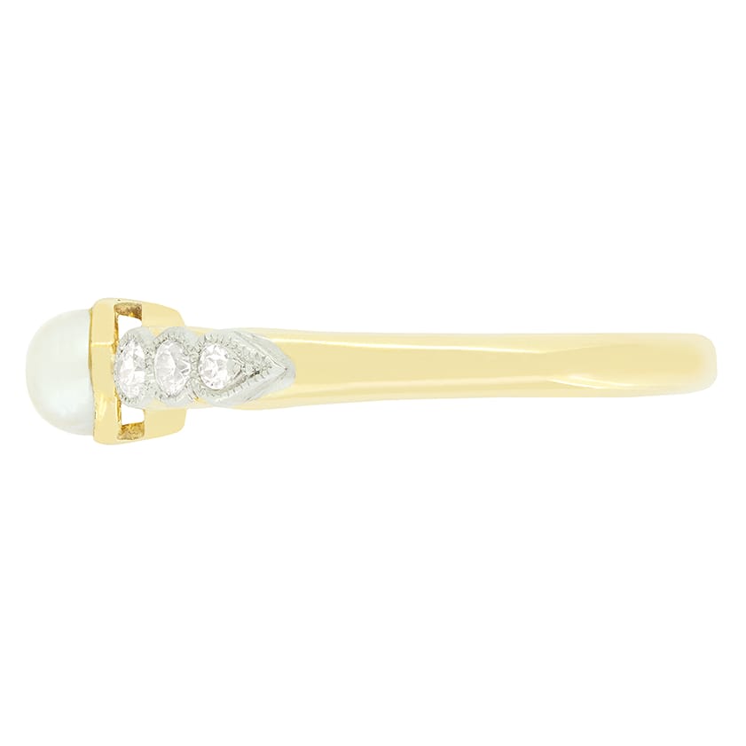 Daring back to the Edwardian era, this charming solitaire ring centres around a single natural pearl. The pear is 4.5mm in width and set upon an 18 carat yellow gold collet. Down each shoulder three old cut diamonds are rub over set into milgrained platinum. These diamonds total 0.24 carat want match in quality at G in colour and VS in clarity. A simple band of 18 carat yellow gold completes this beautiful ring.