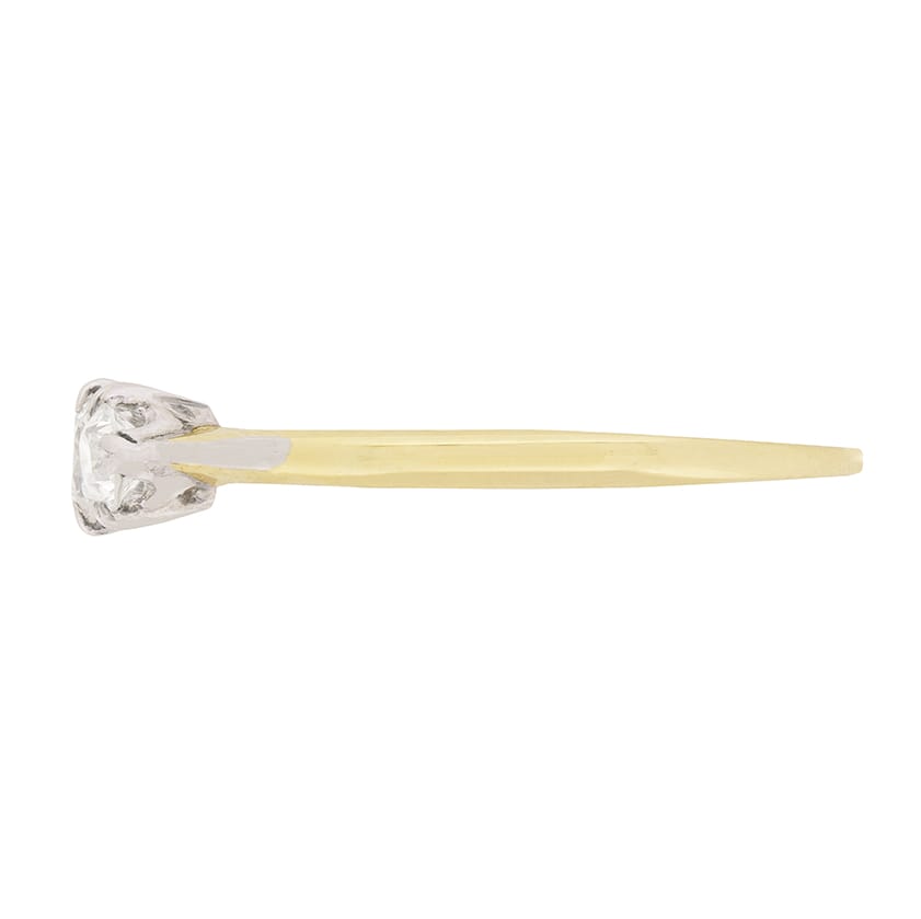 This beautiful hand made ring features a centre diamond weighing 0.30 carat and is supported either side by 0.25 carat diamonds. They are old cut diamonds with estimated grades G in colour and VS in clarity. They are all claw set within platinum collets. The shank is in 18 carat yellow gold with tapered shoulders.