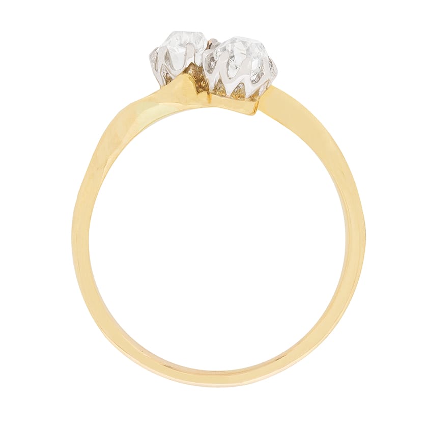 This delicate little ring dates back to the Edwardian era. It features two claw set old cut diamonds, each weighing 0.20 carat. They are estimated as H-I in colour and SI in clarity and set within handmade platinum collets. The band which has a twist design has been made in 18 carat yellow gold.