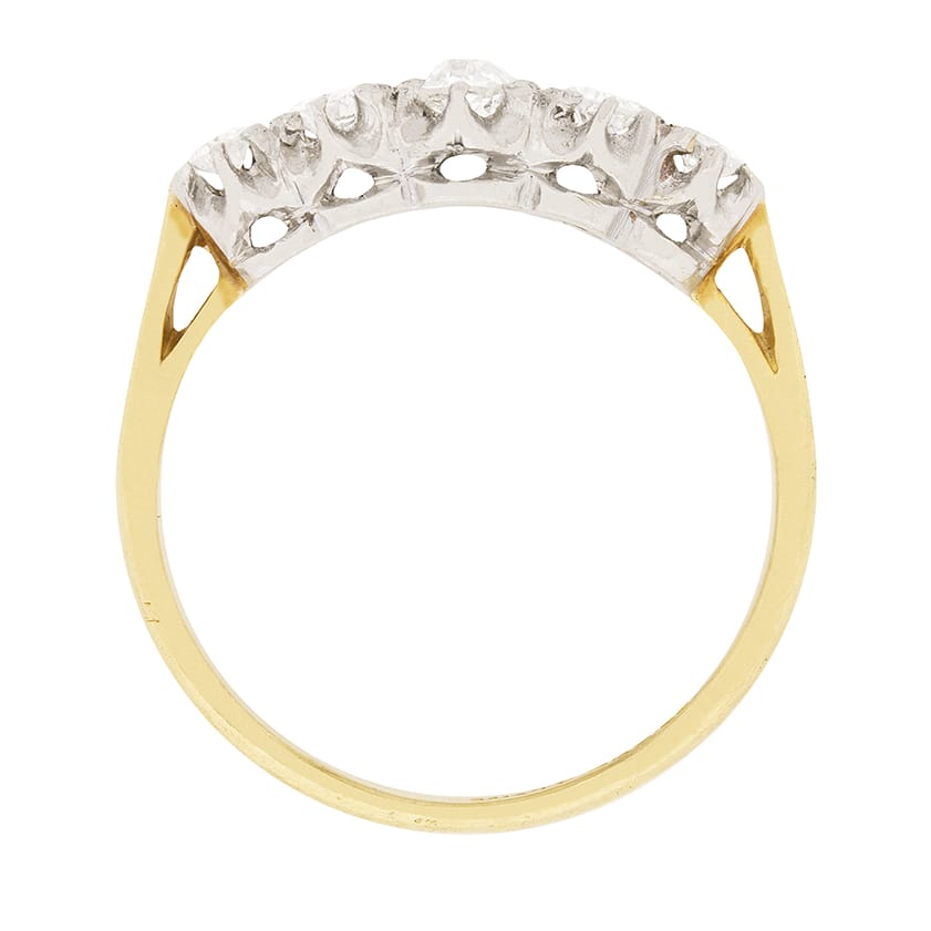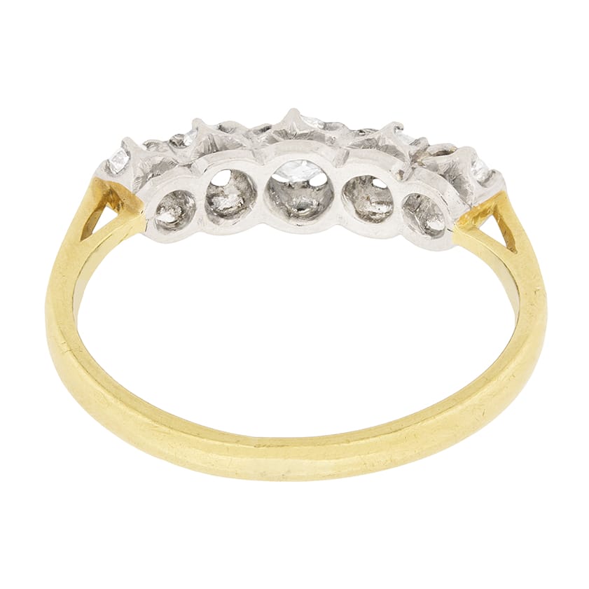 This two-tone, five stone diamond ring originated in the 1920s and it features a sparkling vintage quintet of old cut diamonds.