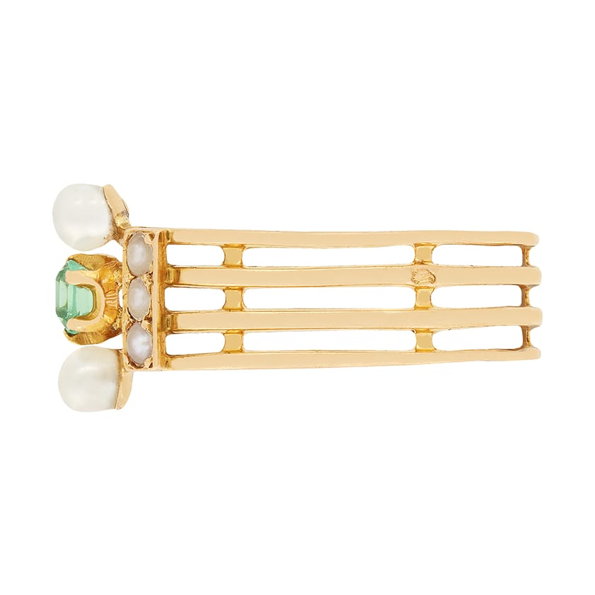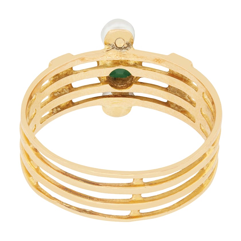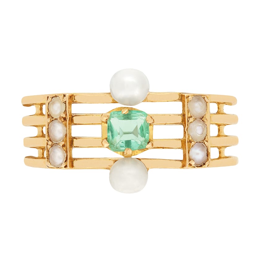 Dating back to the 1880s is this lovely French made dress ring. It has been composed with a combination of one single Emerald and several pearls, ranging in sizes. The claw set Emerald weighs 0.25 carat and is square in shape. Set above and below are a set of pearls measuring approximately 3.17mm. Another three pearls are set to either side, set vertically. These measure at approximately 1.75mm each. The gemstones are spread across four slim bands, made in a warm hue of 18ct rose gold.